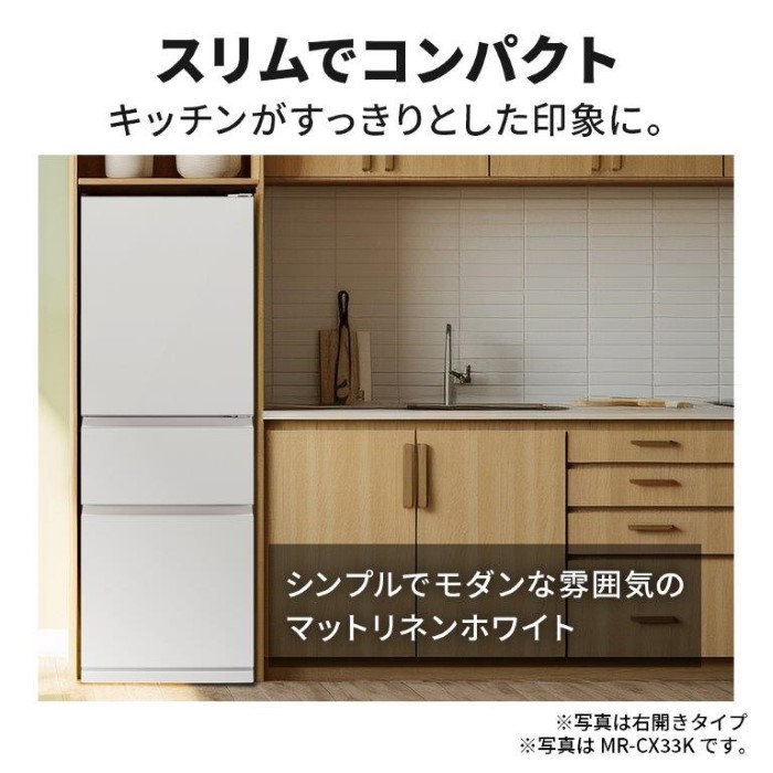 - ■ 三菱電機 ■CXシリーズ MR-CX37K使いやすく高機能な、幅60cmのスリムタイプ。◆ 主な特長 ◆●氷点下なのに凍らせず、生のままおいしさ長持ち!氷点下ストッカーA.I大容量だからこそ、おいしさにもこだわりたい。肉や魚をおいしく便利に保存できる、とっておきの場所があります。●ワイドチルド加工食品や乳製品、手作りおかずや使い分けの食品をまとめて保存できます。(ヨーグルトは除く)●フリーケース(タマゴトレイ付き)ふたつきケースは、バラつきやすい小さな物をまとめて収納できます。また、タマゴケースとしても使えます。●全段ガラスシェルフ全段ガラスシェルフで、汚れがサッと拭き取りやすい。全ての棚が外して洗えます。●ビッグフリーザーまとめ買いした冷凍食品もたっぷり入る大容量。大物は下段、小物は上段にスッキリ収納。●急速冷凍ボタン1つで急速冷凍!素早く冷凍するから食材の細胞破壊を抑え、おいしく冷凍できます。◆ 主な仕様 ◆■定格内容積:365L■各室容量:冷蔵室:215L [168L うちチルドルーム 17L]野菜室:70L [41L]冷凍室:80L [53L]※[ ]内の数字は食品収納スペースの目安■自動製氷:有■外形寸法(約):幅600×奥行660×高さ1,820mm■必要設置スペース(約):幅610×奥行660×高さ1,870mm※設置条件により若干異なることがありますので、10mm程度余裕をとってください。■質量(約):66.0kg※この冷蔵庫は左開きタイプですが、画像や寸法図などは右開きタイプを使用しています。簡易商品仕様シリーズ名:-ブランド名:三菱|三菱電機メーカー型番:MR-CX37KL-W代表カラー:ホワイトドアの開き方:左開き定格内容積:365L本体奥行:656mm本体横幅:600mm本体高さ:1820mm肉・魚の長期保存:有ドア数:3冷凍室位置:下年間電気代:9045円脱臭機能:有省エネ性マーク(緑):省エネ性マーク(緑)カラー:マットリネンホワイト急速冷凍:有ブランド名(カナ):ミツビシデンキ省エネ目標年度:2021配送サービス:設置対応可