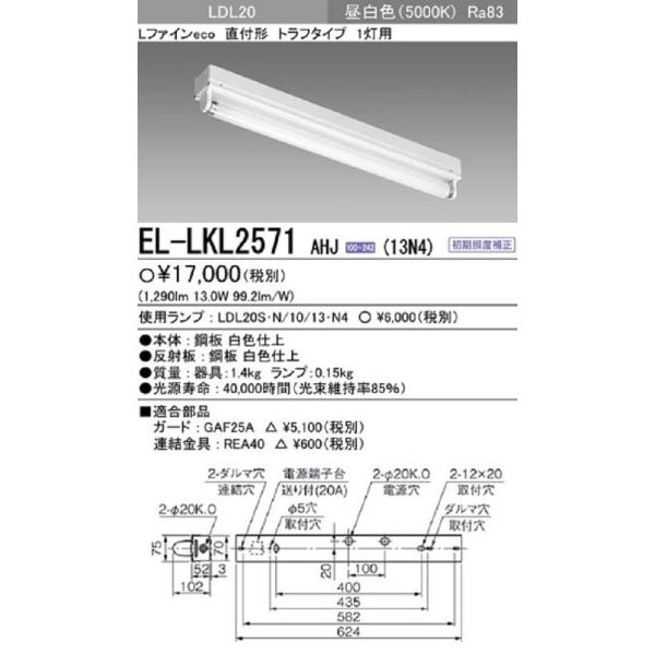 直管LEDランプ搭載ベースライト器具本体 直付形 LDL20タイプ トラフタイプ1灯用 EL-LKL2571AHJ