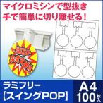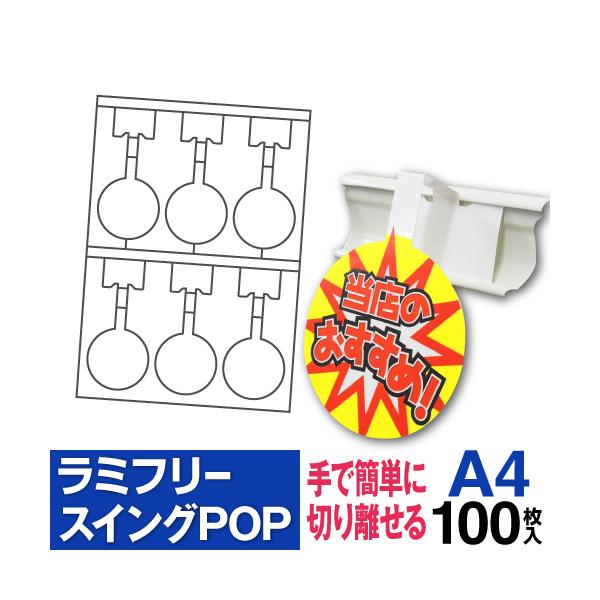 - 紙を特殊フィルムでサンドイッチした耐水紙「ラミフリー」のマイクロミシン型抜き品。 プリント後、ミシン目から切り離すだけで、スイングPOPを作成できます。 商品名:ラミフリー スイングPOP 用紙サイズ:A4 シート枚数:100枚 面付け:6面 坪量:230g/m2 紙厚:0.21mm 対応プリンター:カラーレーザープリンター 【印刷時のご注意】 ※より厚手の用紙に設定し、手差しトレイから給紙してください。 ※よくさばいてからプリンターにセットしてください。 ※印刷した用紙は小まめに排紙部から取り除いてください。 ※機種によってはトナーが定着しにくい場合があります。ラミフリー ラインナップ タイプ サイズ 入数 A判・B判 B5 500枚 ご購入はコチラ A4 10枚 ご購入はコチラ 100枚 ご購入はコチラ 500枚 ご購入はコチラ B4 500枚 ご購入はコチラ A3 50枚 ご購入はコチラ 250枚 ご購入はコチラ 長尺 297×900 50枚 ご購入はコチラ 297×1200 50枚 ご購入はコチラ 320×1200 25枚 ご購入はコチラ NEW 型抜き品 三角立体POP 100枚 ご購入はコチラ テーブルテント 100枚 ご購入はコチラ NEW スポッター 100枚 ご購入はコチラ 吹き出しPOP 100枚 ご購入はコチラ スイングPOP 100枚 ご購入はコチラ 丸型POP 100枚 ご購入はコチラ NEW 名刺カード 250枚 ご購入はコチラ 名刺大カード 100枚 ご購入はコチラ NEW ラミフリー型抜き品 Microsoft Word用テンプレート ラミフリー型抜き品 Adobe Illusrator用テンプレート