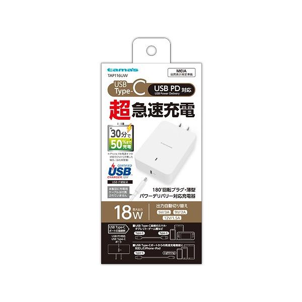 多摩電子 PD 充電器 コンセント充電器 コンセントチャージャー ホワイト USB PD対応 USB Type-C 最大18W TAP116UW