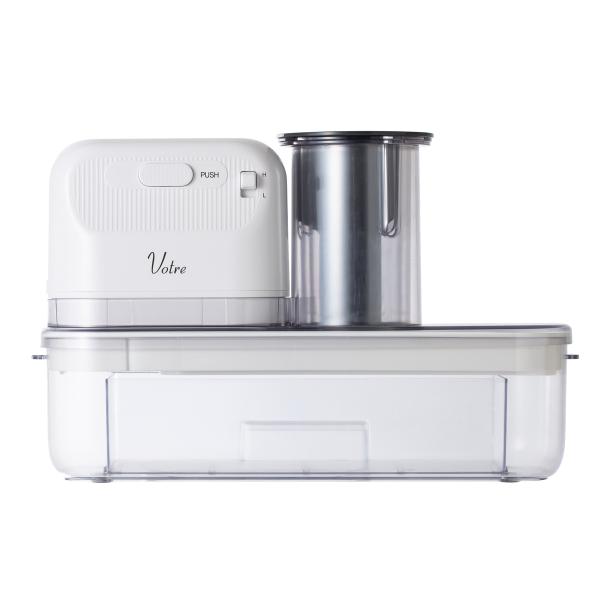 - スライス2種・千切り2種・おろしの1台5役の電動スライサー■「スライス2種(厚・薄)」「千切り2種(太・細)」「おろし」の1台5役を実現!刃を回転させて調理するのではなく、左右に動かして調理!■料理の下ごしらえを「タイパ」良くし、「スぺパ」のアップに!スライス機能で、いっちょう切りや短冊切りも可能なほか、キャベツの千切りにも対応。※タイパ:タイムパフォーマンス、スぺパ:スペースパフォーマンス。■左右の動作で調理「おろし」は、左右の動作で調理することで、手でおろしたような仕上がりとなり、大根おろしを使った「寄せ鍋」や「みぞれ鍋」などをお楽しみいただけます。■調理スピード2段階食材や刃の種類にあわせて2段階の速度から調整可能。■安心設計2か所の運転ボタンを同時に押すことで運転する設計。