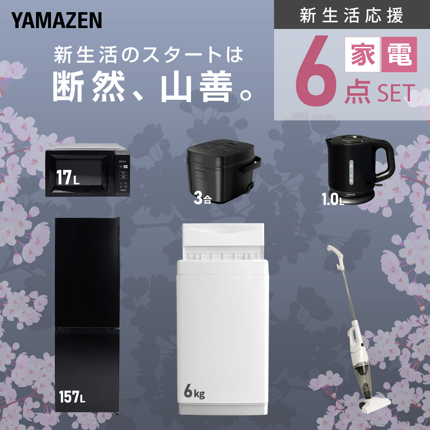 【新生活応援セット】 家電セット 一人暮らし 新生活家電 6点セット 新品 ( 6kg洗濯機 157L冷蔵庫 電子レンジ 炊飯器 電気ケトル スティッククリーナー )
