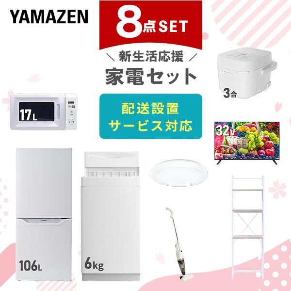 新生活家電セット 8点セット 一人暮らし (6kg洗濯機 106L冷蔵庫 電子レンジ 炊飯器 32型液晶テレビ 電気ケトル スティッククリーナー 家電収納ラック) 山善