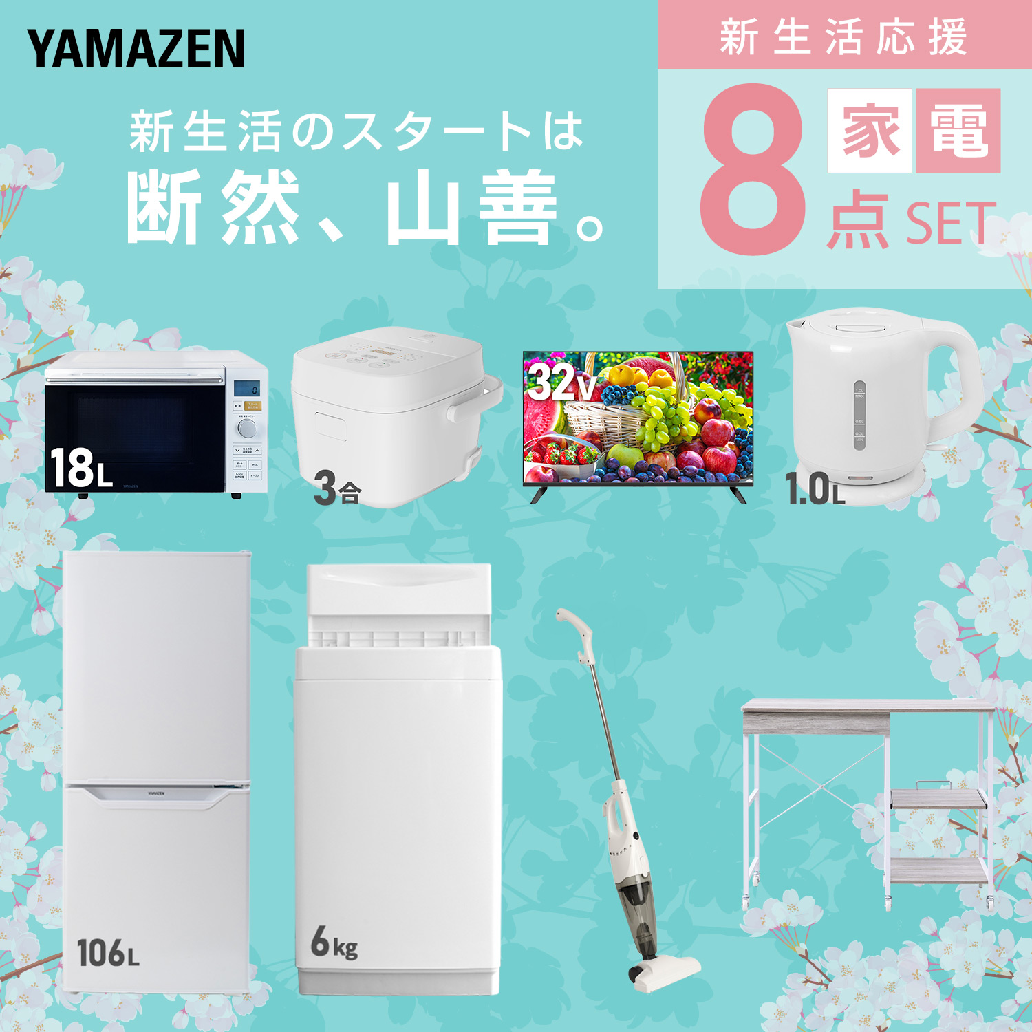 - ↑配送設置サービスの詳細はこちら↑ ↑リサイクルをご要望の方はこちらから↑ 山善 YAMAZEN 【新生活応援セット】 家電セット 一人暮らし 新生活家電 8点セット 新品 ( 6kg洗濯機 106L冷蔵庫 オーブンレンジ 炊飯器 32型液晶テレビ 電気ケトル スティッククリーナー レンジラック ) 商品説明 【洗濯機】●容量:6.0kg(洗濯時)、1.5kg(風乾燥時)●8つのコース搭載(標準・毛布・おいそぎ・ドライ・ソフト・つけおき・部屋干し・槽洗浄) 【冷蔵庫】●容量:106L(冷蔵室73L/冷凍室33L)●年間消費電力量:268kWh/年(50Hz/60Hz) 【オーブンレンジ】●容量18L、フラットテーブル●高周波出力:650W(60Hzのみ)/500W/200W相当 【炊飯器】●炊飯容量:3.0合炊き●8種の炊き分けメニュー:省エネ、白米、早炊き、玄米、無洗米、炊込み、おかゆ、温度調理 【32型液晶テレビ】●サイズ:32V型●2K対応ハイビジョン液晶テレビ 【電気ケトル】●容量:1.0L●空焚き防止機能搭載 【クリーナー】●スティック&ハンディの2WAY●吸込仕事率:40W 【レンジラック】●ゴミ箱上を活用する、しっかり頑丈なキッチンラック●2口コンセント付き(計1500Wまで)でよく使う家電や雑貨をすっきりひとまとめ●ラック以外メーカー保証:1年間 商品補足説明 T3N80 T3N81 YAMAZEN ヤマゼン 山善 通販 新生活応援 新品 新生活家電 洗濯機 全自動洗濯機 6kg 洗濯 冷蔵庫 冷凍冷蔵庫 106L 2ドア オーブンレンジ 電子レンジ 18L フラットテーブル あたため 炊飯器 炊飯機 ライスクッカー 米 3.0合 3合 マイコン式 テレビ 液晶テレビ 32V 32V型 ハイビジョンテレビ 電気ケトル 1.0L 湯沸かし器 掃除機 スティッククリーナー ハンディクリーナー サイクロンクリーナー 家電ラック 冷蔵庫上ラック 収納ラック ワイドラック家電セット ランキング