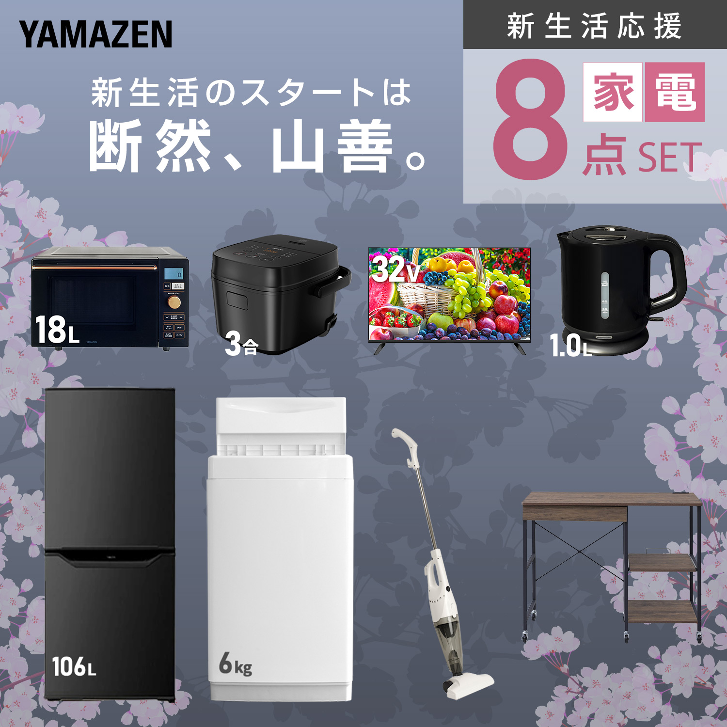 家電セット 一人暮らし 8点セット 冷蔵庫 106L 洗濯機 6kg オーブンレンジ 炊飯器 3合 32型 液晶テレビ 電気ケトル 掃除機 レンジ台