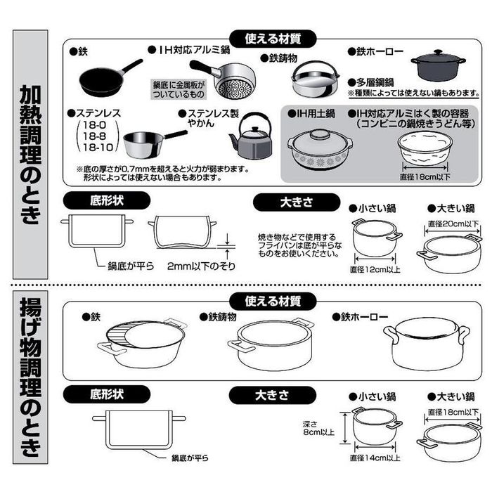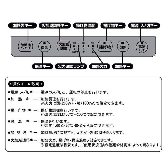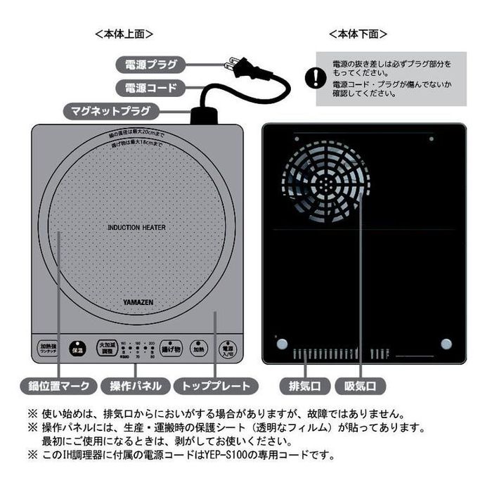 - 【商品解説】低温から高温まで5段階の火力調整ができる、IHクッキングヒーター。火を使わないから安心。コンパクトサイズの幅21.5cm。●5段階の火力調整弱(200W)〜強(1000W)の5段階で設定可能。●揚げ物モード搭載油の温度は160〜200℃で設定可能。●保温モード搭載60/70/80℃で設定可能。●安全機能(1)電源切り忘れ防止自動OFF:最後のキー操作から何も操作しないで約60分(揚げ物)、約120分(加熱・保温)が過ぎた場合、自動的に電源がOFFになります。(2)鍋検知センサー機能:使える鍋、使えない鍋を自動検知。(使えない鍋は、加熱をやめ、電子音でお知らせし、約2分後に運転が停止します)(3)鍋なし自動OFF:鍋をはずすと加熱をやめ、電子音でお知らせし、約2分後に運転が停止します。(4)小物発熱防止自動OFF:ナイフ、フォークなどの小物の場合は加熱をやめ、電子音でお知らせし、約2分後に運転が止まります。(5)空だき防止 自動OFF 異常温度上昇防止:鍋底の温度が異常に上がり過ぎたとき、電子音が鳴り、すぐに運転が停止します。●マグネットプラグ採用万が一、足を引っかけてしまっても外れる安心のマグネットプラグ採用。【スペック】●型式:YEP-S100-B(YEPS100)●JANコード:4983771254895本体サイズ(高さ×幅×奥行):約58×213×253mm(電源コード長さ:1.9m)本体重量:約1.4kgヒーター仕様(コンロ):IH口数:1口火力調節:加熱200〜1000W揚げ物160〜200℃保温60〜80℃調理コースキー:加熱、揚げ物、保温安全機能:電源切り忘れ防止自動OFF鍋検知センサー機能鍋なし自動OFF小物発熱防止自動OFF空焚き防止自動OFF 異常温度上昇防止電源コード長さ:約1.9mコードタイプ:マグネット式電圧:100V最大消費電力:1000W付属品:電源コード仕様1:揚げ物温度:5段階(160/170/180/190/200度)仕様2:保温:3段階(60/70/80度)仕様3:使える鍋:(材質)鉄・鉄鋳物、鉄ほうろう、ステンレス、多層鋼なべ(鍋底形状)底の平らなもの、揚げ物調理の場合そりがないもの、加熱調理の場合そりが2mm以下のもの(大きさ)直径12〜20cmの鍋、揚げ物調理の場合最大18cmの鍋この商品は宅配便でお届けする商品です出荷可能日から最短日時でお届けします。※出荷完了次第メールをお送りします。配送サービス提供エリアを調べることができます「エリア検索」をクリックして、表示された画面にお届け先の郵便番号7桁を入力してください。ご購入可能エリア検索お買い上げ合計3,980円以上で送料無料となります。※3,980円未満の場合は、一律550円(税込)となります。●出荷可能日から最短日時でお届けします。(日時指定は出来ません。) ※お届け時に不在だった場合は、「ご不在連絡票」が投函されます。 「ご不在連絡票」に記載された宅配業者の連絡先へ、再配達のご依頼をお願いいたします。●お届けは玄関先までとなります。●宅配便でお届けする商品をご購入の場合、不用品リサイクル回収はお受けしておりません。●全て揃い次第の出荷となりますので、2種類以上、または2個以上でのご注文の場合、出荷が遅れる場合があります。詳細はこちら■商品のお届けについて商品の到着日については、出荷完了メール内のリンク(宅配業者お荷物お問い合わせサービス)にてご確認ください。詳しいお届け目安を確認する1度の注文で複数の配送先にお届けすることは出来ません。※注文時に「複数の送付先に送る」で2箇所以上への配送先を設定した場合、すべてキャンセルとさせていただきます。