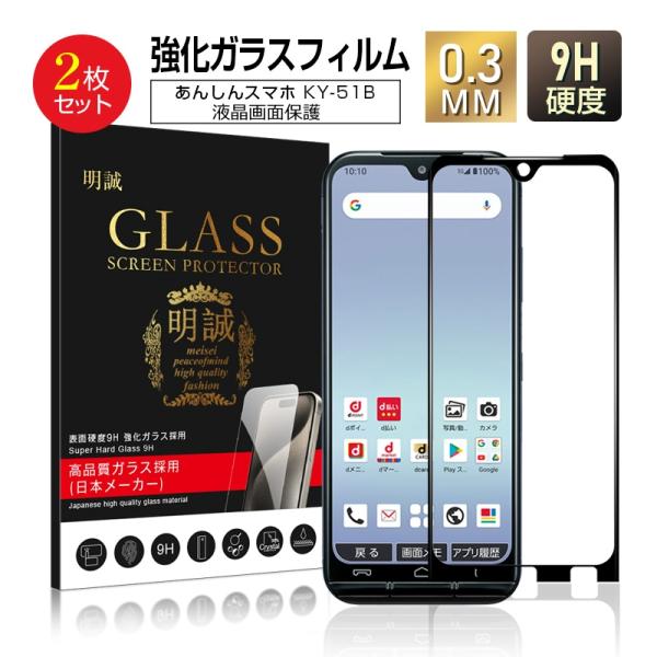 【2枚セット】あんしんスマホ KY-51B ガラスフィルム 液晶保護ガラスシート ドコモ あんしんスマホ 強化ガラスフィルム 3D全面保護 スマホ画面保護シート 傷防止