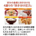 - ごはんの甘み成分(還元糖)を引き出す!発熱効率を高めた「鉄器コートプラチナ厚釜」 選べる2つの保温選択。30時間おいしく保温できる「うるつや保温」・「高め保温」 お米の栄養素を引き出す「熟成炊き(白米・玄米)」 しゃっきりからもちもちまで好みの食感に炊き分ける4通りの「炊き分け圧力」
