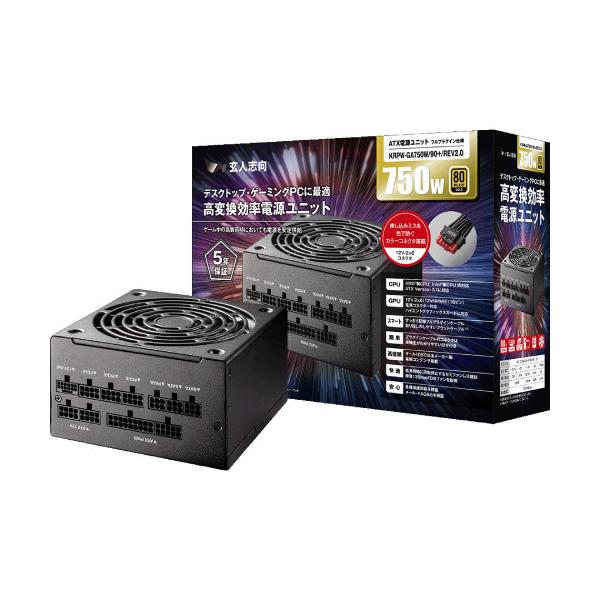 - 【返品種別B】□「返品種別」について詳しくはこちら□■新製品■2026年02月 発売メーカー保証期間 5年【ご購入後のお問い合わせにつきまして】購入後の初期不良・修理・お問い合わせなどアフターサポートにつきましては、玄人志向サポート窓口にご連絡下さい。※画像はイメージです。実際の商品と外観が異なる場合がございます。※外箱・パッケージ等の擦れやへこみは初期不良ではありません。製品自体の不良が無い場合は交換返品をお受けできませんのであらかじめご了承ください。※本製品には保証書が同梱されておりません。お買い上げ明細書(納品書)が保証書となりますので大切に保管してください。ゲーミングPCのあらゆるニーズに応える80Plus GOLD認証電源 『KRPW-GA シリーズ』 REV2.0! ゲーミングPCの電源に求められるニーズを徹底的に追求した80PLUS GOLD認証を取得したPC用ATX電源『KRPW-GAシリーズ』の最新モデルが登場! ・ハイエンドグラフィックボードの消費電力に耐える750W〜1000Wの大容量モデルをラインナップ。・全容量でブラックカラーモデルとホワイトカラーモデルを採用。・全モデルがATX3.1に対応し、80PLUS GOLD認証の優れた電源変換効率で、省エネかつ発熱を抑えた長寿命製品。・様々なパーツにより煩雑になりがちなPCケース内をスッキリさせられるフルプラグイン&フラットケーブル。・2系統のATX12Vケーブルは、裏配線もしやすい70cm。・オール105℃日本メーカー製アルミ電解コンデンサで、高い信頼性。・大口径135mmファン&セミファンレス対応で、静音性にも高いこだわり。・保証期間は前リビジョンからさらに延長された安心の5年保証! 高品質なマテリアルで構成されているため、安定性や信頼性、製品寿命にも期待ができるゲーミングPC向け電源は、安心して使いたい一般のPCにもおすすめです。まさに死角のない、決定版のPC電源です。◆16ピン電源コネクターの挿し込みミスを防ぐカラーコネクターを採用挿し込みが浅いことでトラブルになりやすい16ピン電源コネクター(12V-2x6)に、カラーコネクターを採用しました。コネクターの接続時は、コネクターの赤色が見えなくなるまでしっかり奥まで挿し込み、ラッチが確実にロックされていることを確認してください。*カラーコネクターはあくまで目安になります。コネクターのクリアランス(遊び・余裕)によっては、奥まで挿し込んでも赤色が見える場合があります。◆高品質・高耐久を証明する5年保証高品質・高耐久マテリアルを採用することで、保証期間を5年にすることができました。より長く、安心してお使いいただける電源ユニットに進化しています。◆80PLUS GOLD 認証を取得した、高電源変換効率電源KRPW-GA REV2.0シリーズは、電源変更効率90%以上の80PLUS GOLDを取得。電源変換効率が高いため、消費電力・発熱・ファンの騒音を抑え、製品の長寿命にもつながります。◆16ピン電源コネクタ(12V-2x6)プラグインケーブル搭載で、最新グラフィックボードにも対応KRPW-GA REV2.0シリーズは、16ピン電源コネクタ(12V-2x6)プラグインケーブルが搭載可能です。補助電源に16ピン電源ケーブルを必要とする最新のグラフィックボードにお使いいただけます。70cmのATX12Vケーブルで電源下置きや裏配線に対応電源を下部に設置するタイプのPCケースや裏配線にも使いやすい、ATX12Vケーブル 70cm 2系統。◆すっきりスマートに配線可能なフルプラグイン&フラットケーブル多数のパーツをケース内に搭載して、ケーブルの取り回しが煩雑になりがちなゲーミングPC。KRPW-GA REV2.0シリーズはフルプラグインを採用し、使いたいケーブルだけを取り付けることで、ケース内のケーブル数を抑えます。また、フラットケーブルのため、ごちゃごちゃになりがちなケーブルをスッキリと配線いただけます。◆高い信頼性で長く使える、オール105℃日本メーカー製アルミ電解コンデンサ搭載搭載されているコンデンサーは全て高温に強く、信頼性の高い日本メーカー製の105℃コンデンサーです。温度による劣化を抑え、長く製品をお使いいただけます。◆大口径ファン&セミファンレスで、冷却性能と静音性がアップ! 大径 135mm FDB(流体軸受)ファンを搭載しており、高い冷却性能を発揮。安定性を高めつつ、製品寿命にも効果を発揮します。また、セミファンレスコントロール機能により静音性もバッチリです。■ 仕 様 ■サイズ:150 x 150 x 86 mm (突起部、ケーブル除く)ファン:13.5cm ファンコントロール機能搭載(セミファンレス)規格:ATX Ver3.1 に対応電源容量:750W入力:AC 100-240V 47-63Hz 10A80PLUS:GOLDPFC回路:ActivePFC搭載保護回路:過負荷保護(OPP)過電流保護(OCP)過電圧保護(OVP)低電圧保護(UVP)短絡保護(SCP)過温度保護(OTP)無負荷運転保護(NLO)保証期間:5年サポート:RoHS:◯PSE:対象外電波法:対象外※16ピン電源コネクタ(12V-2x6)は、従来の16ピン電源コネクタ(12VHPWR)と互換性があります。※本製品の冷却ファンは、負荷によって電源ユニット内の温度が上昇するまで回転いたしません。※Intel PSU DG 1.4以降に対応してい