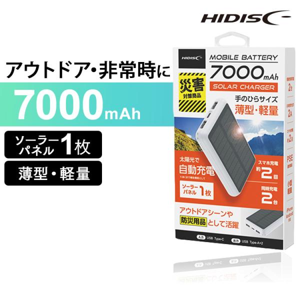 - [検索用:モバイルバッテリー 大容量 iPhone ソーラー タイプC iPhone対応 ソーラーパネル1枚 7000mAh HIDISC ハイディスク 正規品 2台同時給電 USB-A type-C スマホ 4984279862506]