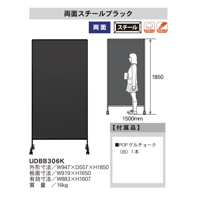 - 【商品説明】●特徴:ブラック枠でオフィスや工場にマッチする、書き消しや掲示の出来るパーティションです。書き消しが出来て、マグネットが使えます。スタッキングができてスッキリ収納できます。●用途:オフィス、カフェ、飲食店、事務所、学校、会社、塾、受付、打ち合せスペース、商談スペース、テーブル、カウンター、工場、倉庫、教壇、医療施設など●材質:表面材:両面スチールブラック 枠:アルミ ベース:スチール●枠の色:ブラック●タイプ、板面表示:両面脚付、無地/無地●外形寸法W×D×H(mm):947×557×1850●板面寸法W×H/有効寸法W×H(mm):919×1650/883×1607●注意事項:※板面の汚れは、水拭きにて拭いてください。水拭きの後は、必ず乾いてからご使用ください。※別売の脱着式ペントレイブラックUTR900-K、UTR600-Kが使用できます。馬印 UMAJIRUSHI ホワイトボード 黒板 ブラックボード チョーク 事務用品 ホーローホワイト オフィス家具 パーテーション 展示パネル 文具用品 案内板 展示用品 店舗用品 株式会社馬印 プレゼン・会議・セミナー用品 オフィス 会議室 学校 ミーティング 塾 研究室 事務所 会社 事務所用品類似商品はこちら馬印 UDHH306K 直送 代引不可・他メー54,496円馬印 APMCV306 直送 代引不可・他メー45,796円馬印 APVV306 直送 代引不可・他メーカ31,972円馬印 APVK-B306 直送 代引不可・他メ30,258円馬印 APVK-G306 直送 代引不可・他メ30,258円馬印 AP-23TBDK 直送 代引不可・他メ23,459円馬印 AP-22TBDK 直送 代引不可・他メ21,283円馬印 UDM600B 直送 代引不可・他メーカ32,373円馬印 AP-23THDK 直送 代引不可・他メ26,368円馬印 AP-22THDK 直送 代引不可・他メ24,914円馬印 AR306 直送 代引不可・他メーカー同27,022円馬印 UDM60TEB 直送 代引不可・他メー40,483円