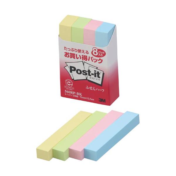 付箋 スリーエム ジャパン ポスト・イット再生紙ふせんハーフ 75×12.5mm100枚×8 4色混色 560RP-BK