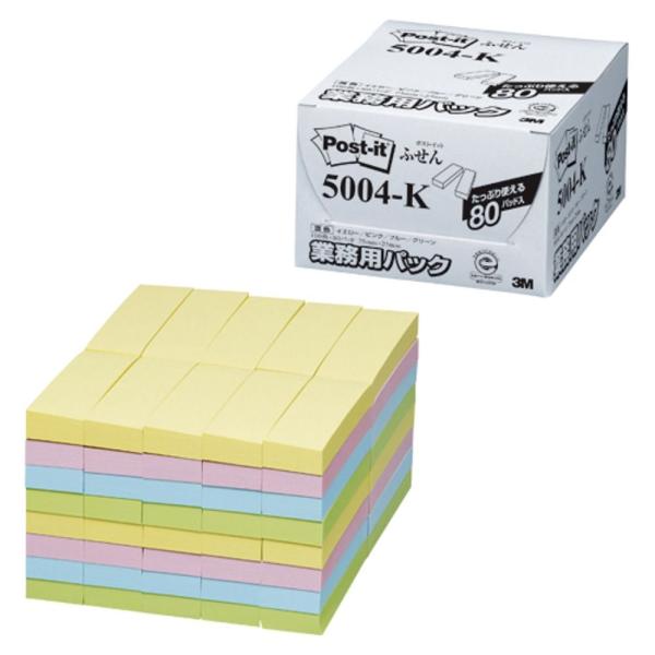 - ★ポストイット 業務用パック■メーカー:3M■品番:5004-K■用紙サイズ:75×25mm(25mm側が粘着)■色:混色(イエロー、ピンク、ブルー、グリーン)■入数:100枚×80パッド