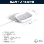 - Qi規格対応:AirPods エアポッズ ( エアポッツ エアーポッズ ) シリーズをはじめ、iPhoneやAndroidのスマートフォンなどにも広く使われているワイヤレス充電「Qi」規格に準拠した充電器です。イヤホンケース専用:Apple AirPods Pro エアポッズ プロ / AirPods エアポッズ のWireless Charging Case に最適なサイズです。手元に置いてもデスクに置いても邪魔にならないコンパクトな小型サイズ。もちろんアップル社以外のQi対応イヤホンケースでも充電にお使い頂けます。(ご自身の責任でサイズをご確認ください)1年保証付品質:日本市場で求められる厳しい品質基準を満たし、当店人気の40sブランドの規定品質を全数チェックの上で出荷されています。そうした高品質の証として標準で1年保証がついています。充電ケースカバー対応:Wireless Charging Case にシリコン製やゴム製のカバーを付けた状態でも充電可能です。おくだけで充電できますので大変便利です。※ただし、分厚いものや金属製の素材を用いたカバーは充電が不安定であったり充電できないことがございます。また、充電効率(充電時間)をお求めになる場合はカバーを外して充電してください。シンプルデザイン:必要な要素のみに特化したミニマルなデザイン、カラーはホワイトとブラック、いずれもシンプルで設置場所を選びません。本体は質感のあるプラスチック樹脂を使用、底面にはラバーを用いて滑り止めになっています。安定感のある形状と重量で、仮にiPhoneを乗せても不安定になりませんので、Qiワイヤレス充電対応のスマートフォンの緊急充電も可能です。おしらせランプ:充電中は本体前面のLEDランプが緑色に点灯します。スタンバイ時(充電をしていない時)はブルーに点灯しています。もし本体充電面に充電に影響をあたえる金属製異物(クリップやコイン等)を感知した場合にはブルーLEDが点滅してお知らせします。直結ケーブル:製品のコンパクト化と高信頼性維持のため、ケーブルは直結されています。USB製品に起こりがちなUSBコネクタ部の劣化や破損を防ぎます。簡単な接続:本製品にUSB電源アダプタを接続するだけですぐ通電してお使い頂けます。※DC5V対応のUSB電源をご利用ください。充実の付属品:イヤホンや充電ケースのお手入れに最適なマイクロファイバークロスを付属。取扱説明書はもちろん日本語、パッケージも軽量エコタイプで、全て40s専用に作られています。 メーカー希望小売価格はメーカーカタログに基づいて掲載しています【商品概要】 Apple AirPods Pro エアポッズ プロ / AirPods エアポッズ の Wireless Charging Case に最適なワイヤレス充電器、Qi対応の充電器です。 シンプルでミニマルなデザイン、コンパクトで場所を選ばず利用可能です。充電ケースにカバーを付けた状態でも置くだけで充電できます。アラート機能付きのお知らせLED、直結ケーブル、安定した形状と重量、小型の筐体に必要要素を詰め込んだ、おしゃれなワイヤレス充電器です。 40sブランド品質チェック済、標準で1年保証がついています。また、お手入れ用のマイクロファイバークロスや日本語の取扱説明書など、付属品も充実。 アップル社のAirPodsシリーズ以外のイヤホンのQi対応充電ケースにもお使いいただけますし、iPhoneやAndroidのQi対応スマートフォンにも応急的な充電用途としてはお使い頂けます。※ただしいずれも形状及び充電面の接触についてはご自身の責任でご確認のうえご購入ください。 【主な仕様】 ・対応規格:Qi規格 ・入力: DC5.0V/1.5A ・出力: 5W ・USB形状:USB TypeA オス ・効率性:: ・動作範囲: