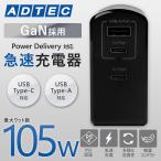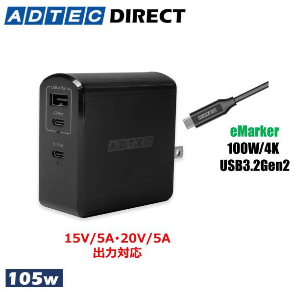 アドテック PD充電器 105W 3ポート【eMarker搭載100W Type-Cケーブル付属】【USB-Cx2+USB-A】【PD/GaN (窒化ガリウム) ブラック/APD-A105AC2-wC-BK
