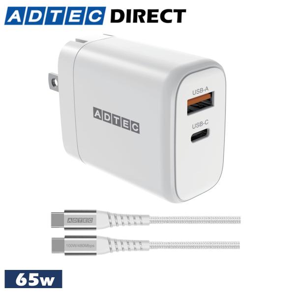 【長い2m Type-Cケーブル付属】APD-V065AC-wC20U2-WH PD充電器 65W 2ポート【eMarker搭載100W】【USB-C+USB-A】【PD3.0/GaN (窒化ガリウム) 】ホワイト
