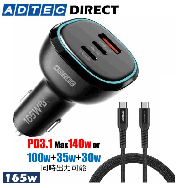 165W 3ポート シガーソケット PD3.1充電器 ACPD-V165AC2-wC20U2 Type-Cケーブル付 2m【USB-Cx2+USB-A】カーチャージャー Macbook Pro iPhone QC3.0 PD3.0