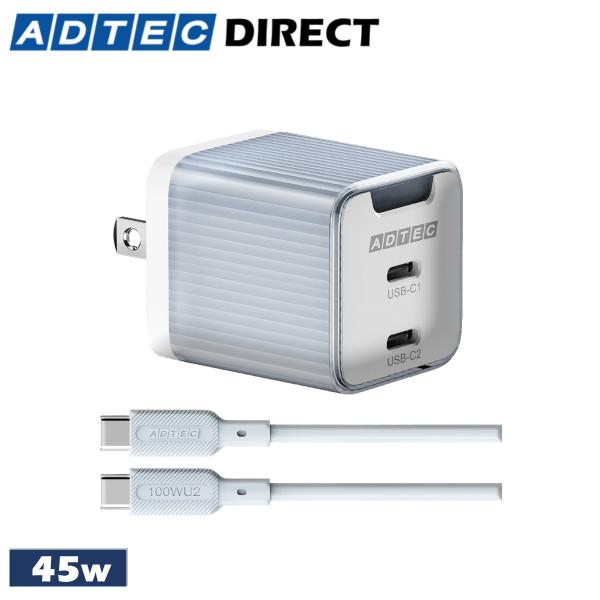 APD-V045C2-BL-SC10U2 ブルー パステル カラー 45W 2ポート PD充電器 シリコン製Cケーブル(100W/eMarker) 【USB-Cx2】【PD3.0/GaN/PPS 3.3V-11V】アドテック