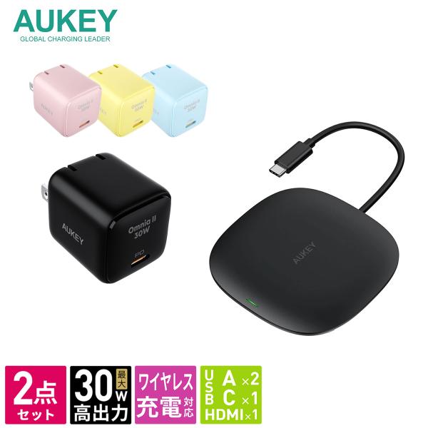 超小型USB充電器+ワイヤレス充電機能付きUSBハブセット AUKEY オーキー CCB-55 30W充電器 ACアダプター 急速充電 ワイヤレス充電 PD 高速データ転送 HDMI