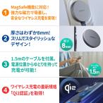 - 【MagSafe機能に対応】MagSafe機能搭載iPhoneシリーズに強力な磁力で正確な位置にピタッと吸着し、安全なワイヤレス充電を行えます。【Qi2認証を取得】ワイヤレス充電の最新規格Qi2の公式認証を取得しています。従来のQi(7.5W相当)の2倍の最大出力となる15Wの高出力を実現しました。Qi2対応iPhoneシリーズなどの機器の急速充電が可能です。【1.5mのケーブルを付属】付属品には、使い勝手の良い長めの1.5mのケーブルを採用し、コンセントの位置からゆとりを持っての充電が可能です。日常使いに活躍します。【スリムでスタイリッシュなデザイン】本体はアルミ合金とガラスで構成され、高級感があるスタイリッシュな外観です。わずか8mmの薄さで、重量は約45gと超軽量なので、収納・持ち運びに大変便利です。ご家庭やオフィス、外出先などさまざまな場所で気軽にご使用いただけます。【ご購入前の注意事項】※マグネットでの吸着はMagSafe搭載のiPhoneシリーズのみ対応しております。※本製品はApple Watchの充電には対応しておりません。※本製品はUSB-Cポートからの充電ができるUSB充電器(別売)と一緒にご使用ください。※本製品はMagSafe対応のiPhoneシリーズでのご使用を推奨しております。MagSafe非対応の機種やケースに、MagSafe化をうたったマグネットステッカーなどを使用した場合の本製品の動作保証はいたしかねますので予めご了承ください。※最大15Wの出力でのマグネット式ワイヤレス充電は、Qi2対応機種またはiOS 17.4にアップデートしたiPhone 12以降のモデルになります。※15Wでのワイヤレス充電のためには、20W出力以上のPD充電器(別売)が必要です。※消費電力の負荷の高い(電池の減りの早い)ゲームアプリやBluetooth通信などを使用しながらの充電では、充電時間が長くなる、電池残量が減っていく、満充電にならない、などの現象が起こったり、発熱によって充電が止まってしまうことがあります。また、ご使用の機器のCPU性能や環境温度などによっても同様の現象が起こる場合がございます。予めご了承ください。