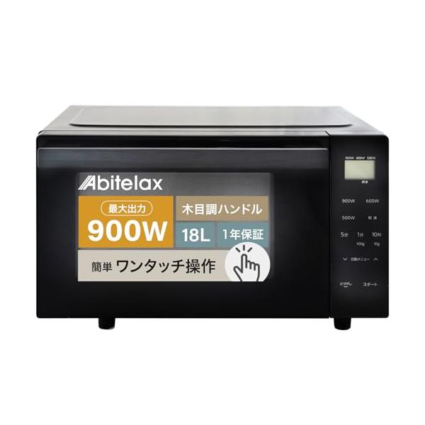 - 吉井電気のプライベートブランド「アビテラックス」の新しい定番、ARF-18VFAM(K)。毎日の“温め”を、もっと直感的に、もっとスマートに。 〇最高出力900W:冷凍食品や冷えたお弁当も素早く加熱。忙しい朝やランチタイムも一瞬で準備完了。〇木目調の持ち手:美しさと使いやすさの両立。ブラックの本体に映える温もりあるアクセント。無骨になりがちな家電も、インテリアと自然になじみます。〇フラットテーブル:回転皿なしで庫内が広々。深めのお皿も置きやすく、お手入れもサッと一拭き。〇シンプルな縦開き扉:出し入れがスムーズで、省スペースな設計。〇見やすい表示パネル:見やすく大きな文字で、直感的に操作可能。〇自動メニュー4種(飲み物、ご飯、お弁当、ひき肉解凍)で、よく使う調理はワンタッチ。〇タイマー機能付きで、余熱や微調整も自在。〇容量は18L。ひとり暮らしや二人暮らしのキッチンにぴったり。〇インバーター&ヘルツフリー設計:50Hz/60Hzどちらでも使える全国対応。引っ越しや転勤が多くても買い替え不要。 【高出力の900W】忙しい時間でもすぐ温まります。毎日の家事が時短に。