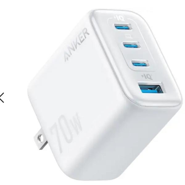 - 【特長】●単ポート最大70W出力に対応します。●スマホやタブレットはもちろん、MacBook Airにも急速充電が可能です。●2つの USB-Cポートを同時に使用することで、ノートパソコンとスマートフォンを同時に急速充電できます。●3つのUSB-Cポートと1つのUSB-Aポートで合計64.5W、単ポート最大70W出力が可能なため、MacBookを含む複数のデバイスを同時に急速充電が可能です。●コンパクトかつ軽量な設計を実現し、プラグは折りたたみ式のため、どこでも簡単に持ち運ぶことができます。●重心位置の調整に加え、プラグ本体へ厚みを持たせ摩擦力を向上させ、複数機器を充電しても落ちづらい設計を実現しました。【仕様】●色:ホワイト●ポート数:4●幅(mm):50●奥行(mm):50●高さ(mm):32●定格入力:100-240V~, 1.8A, 50/60Hz●出力単ポート使用時:USB-C1 / 2 / 3 : 5V=3A / 9V=3A / 15V=3A / 20V=3.5A (70W Max)USB-A1: 5V=3A / 9V=2A / 12V=1.5A / 10V=2.25A (22.5W Max)●出力2ポート使用時:67.5W Max3ポート使用時:64.5W Max●対応機種タブレット端末:iPad Pro シリーズスマートフォン:iPhone 17 / 16 / 15 / 14 シリーズ、Samsung Galaxy S25 / S24 / S23 / S22 シリーズ、Samsung Z Fold4 / 5 / 6 / 7、Google Pixel 10 / 9 / 8 / 7 シリーズその他:AirPods Pro 2 / Pro 1AirPods 4 / 3 / 2 / 1Apple Watch Ultra / 10 / 9 / 8 / SE SeriesGalaxy Buds2 Pro / 2 / LiveGalaxy Watch7 / 6 / 5 Series【注意】●65W入力以上のPCを充電する際は、USB-C単ポートのご利用をおすすめします。【セット内容/付属品】●取扱説明書●18ヶ月保証 + 6ヶ月 (Ankerで会員登録後) ●カスタマーサポート【特長】●単ポート最大70W出力に対応します。●スマホやタブレットはもちろん、MacBook Airにも急速充電が可能です。●2つの USB-Cポートを同時に使用することで、ノートパソコンとスマートフォンを同時に急速充電できます。●3つのUSB-Cポートと1つのUSB-Aポートで合計64.5W、単ポート最大70W出力が可能なため、MacBookを含む複数のデバイスを同時に急速充電が可能です。●コンパクトかつ軽量な設計を実現し、プラグは折りたたみ式のため、どこでも簡単に持ち運ぶことができます。●重心位置の調整に加え、プラグ本体へ厚みを持たせ摩擦力を向上させ、複数機器を充電しても落ちづらい設計を実現しました。【仕様】●色:ホワイト●ポート数:4●幅(mm):50●奥行(mm):50●高さ(mm):32●定格入力:100-240V~, 1.8A, 50/60Hz●出力単ポート使用時:USB-C1 / 2 / 3 : 5V=3A / 9V=3A / 15V=3A / 20V=3.5A (70W Max)USB-A1: 5V=3A / 9V=2A / 12V=1.5A / 10V=2.25A (22.5W Max)●出力2ポート使用時:67.5W Max3ポート使用時:64.5W Max●対応機種タブレット端末:iPad Pro シリーズスマートフォン:iPhone 17 / 16 / 15 / 14 シリーズ、Samsung Galaxy S25 / S24 / S23 / S22 シリーズ、Samsung Z Fold4 / 5 / 6 / 7、Google Pixel 10 / 9 / 8 / 7 シリーズその他:AirPods Pro 2 / Pro 1AirPods 4 / 3 / 2 / 1Apple Watch Ultra / 10 / 9 / 8 / SE SeriesGalaxy Buds2 Pro / 2 / LiveGalaxy Watch7 / 6 / 5 Series【注意】●65W入力以上のPCを充電する際は、USB-C単ポートのご利用をおすすめします。【セット内容/付属品】●取扱説明書●18ヶ月保証 + 6ヶ月 (Ankerで会員登録後) ●カスタマーサポート