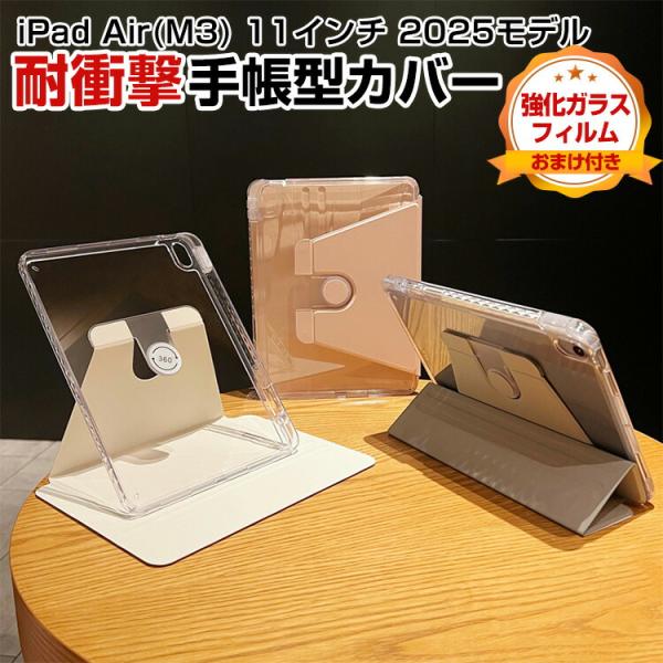 - アップル iPad Air 11インチ (M3チップ) 2025年春モデル ケース カバー タブレットケース 耐衝撃カバー CASE オートスリープ 手帳型カバー Pencil収納機能 スタンド機能 PUレザー ブックカバー 透明背面カバー 強化ガラス付き