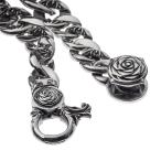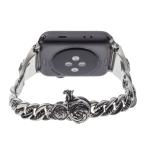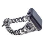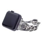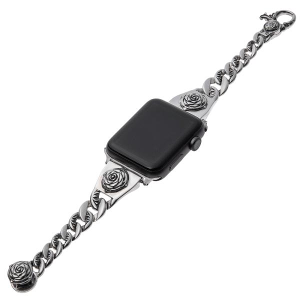 925シルバー製ブレスレットタイプの「アップルウォッチバンド」。脱着はナスカンで留める形式。チェーンは交互に唐草柄の入った喜平チェーン。随所に薔薇デザインが施される美麗なデザイン。重厚で存在感があり、銀の光沢や輝きが美しい。