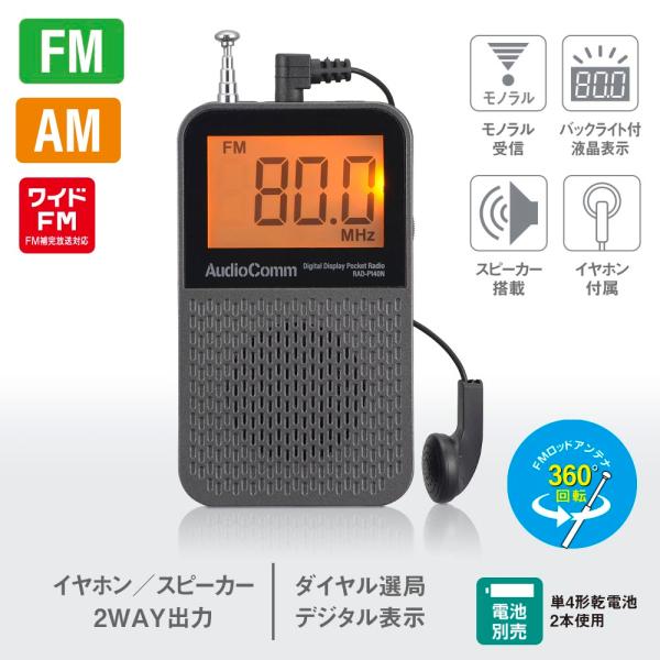 - 【 特 長 】 ● 大きくて見やすいデジタル表示、ダイヤル選局式 ● バックライト付き液晶表示で、暗い場所でもらくらく選局 ● モノラル受信 ● イヤホン/スピーカー2WAY出力 ● 片耳モノラルイヤホン付属 ● 360°回転式FMロッドアンテナ ● ワイドFM(FM補完放送)対応 【 仕 様 】 ■ 電源:DC3V 単4形乾電池×2本(別売) ■ 受信周波数:AM…522-1620kHz(9kHzステップ)、FM…76-108MHz(0.1MHzステップ) ■ スピーカー:口径36mm×1(8Ω) ■ 乾電池持続時間: スピーカー時…AM受信/約37時間、FM受信/約36時間 イヤホン時…AM受信/約49時間、FM受信/約43時間 ■ 接続端子:イヤホン端子(φ3.5mmモノラルミニジャック) ■ 外形寸法:幅55×高さ94.5×奥行19.5mm(突起物含まず) ■ 質量:約66.5g(乾電池含まず) ■ 付属品:イヤホン、保証書付取扱説明書