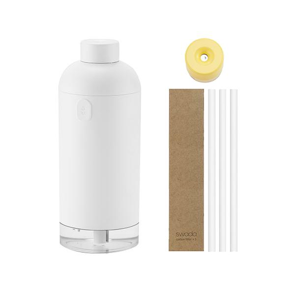 - いつでも清潔に、振動板を交換できるサステナブルなポータブル加湿器 + 交換用振動板モジュール + 交替用専用フィルター(3個)BLUEFEEL(ブルーフィール) コードレス加湿器 SWADA(スワダ)は、振動板(ミスト吹出口)がモジュール式で簡単に交換できるポータブル超音波式加湿器です。フィルターはもちろんのこと、、振動板も交換でき100%クリーンに使える加湿器です。きれいな水だけで豊かにミストを噴霧しいつまでも清潔に加湿できます。 ■ モジュール式で振動板が簡単に交換できる 加湿器の振動板(ミスト吹出口)はカビや雑菌が溜まりやすく白いガサカサな塊で劣化しやいです。BLUEFEELは、このような悩み解消に着目し、技術力で振動板部分とフィルターを全て交換可能にした超音波式加湿器です。 SWADA(スワダ)は振動板のパーツをいつでも清潔な新品に交換できます。 ボトルの蓋のように回すだけで簡単に取替可能です。 新しい振動板パーツに交換することで、健康で安全な加湿器生活を送る事が出来ます。 ■ 人にも環境にも優しいサステナブルな暮らしへ SWADA(スワダ)は消耗品である振動板パーツやフィルターを交換することで長く愛用してもらい、健康的で持続可能な環境への配慮に取り組みます。振動板の劣化で加湿器ごと廃棄されることによるプラスチックゴミを減らし、振動板のみを交換していただく仕組みになっています。人にも環境にもやさしいポータブル加湿器です。 【最強クラス、100ml/hのパワフル加湿量、高く噴霧】 高性能の超音波振動板と低電力設計の理想的な組み合わせで、1つの噴射口からデュアルレベルの強力な1時間最大100mlの超音波ミストを噴出します。 噴出したミストは床に流れる暇もなく、高く、素早く、強力な加湿量を長く保ち、快適な空気環境を作ります。また、2種類の加湿モードで自分の好みに合った噴霧量を選択できます。 【いつでもどこでもスマートに潤う、コードレスで自由な生活】 ■ コードレスで最大約8時間 2200mAhのリチウムイオンハ?ッテリーを搭載したUSB充電式のコードレスなので、完全ホ?ータフ?ルとして最大約8時間使用可能。どこでも好きな時に、置く場所を選ばずに加湿できます。 ※使用時間8時間はモード1でご利用の場合です。 ※作動時間は目安です。使用頻度や条件(水量・モード)により異なります。 ■USB-Cで簡単スピード充電 SWADA(スワダ)は、USB-C充電ポート搭載。急速充電に対応し、付属のUSB-Cケーブルと急速充電対応(5V/2A)のACアダプタを使えば約4.5時間で本体へ満充電が可能です。 ※急速充電をするには急速充電対応のACアダプタやモバイルバッテリーが必要になります。 ※充電用アダプタは付属されておりません。 【目に優しく快適な3000Kムードライトで癒しの空間に】 SWADA(スワダ)には、目が一番楽に感じる3000KのLEDライトが付いており、タッチボタンを長押しするだけでON/OFFできます。 気分や環境に合わせてLEDライトを付ければ、柔らかい光がリラックス空間を演出するムードライトとして優しい明るさを提供します。 【低騒音設計】 パワフルなミストながら静音振動板設計により動作音がほぼなく、とても静かに使えるように低騒音設計されています。寝室や、赤ちゃんが寝る部屋にもストレスなく加湿する事ができ、静かでリラックスした空間を演出します 【安全・安心の仕組み】 SWADA(スワダ)の商品開発にはサムスン電子出身の優れた技術者が集まっており、安全面にはノウハウとリソースを惜しみなく注ぎ、安心してお使いいただける、安全・安心の製品づくりを行っています。 ■ 安全保護センサーで電源自動オフ 安全保護センサーは、水の水位を自動感知し、水不足時の異常兆候を素早く感知し電源を自動OFFすることで、加湿器とフィルターの寿命を保護します。水の入れ忘れがあっても安心の空焚き防止機能です。 ■ 防水設計 電気系統部分に水が入ったり、濡れたりすることで発生する危険を防止するため、防水シーリングを搭載しています。 タッチボタンはボタンと本体の隙間がないので、水分がボタンの間に入ることによる故障を防止します。直感的なユーザビリティとシンプルなデザインにしたことで製品の完成度を高めています。 ■ 安全の証明 電気製品の安全性に関わるKC、欧州CE認証、米国連邦通信委員会FCC認証も取得済み。使用者及び消費者の健康と安全保護を規定した様々な安全基準を満たしており、品質面でも安心してお使いいただけます。 【ミニマルなボトルデザイン】 SWADA(スワダ)は、無駄を削ぎ落とし、洗練されたスタイリッシュでシンプルなデザインです。 ミニマリズムを実現させるシンプルなボトルデザインと原色の振動板パーツがインテリアのアクセントになります。 コンパクトでありながら500mlの大容量に、直感的なタッチボタンのみ。必要最低限の機能とサイズで、空間に満足感を与えます。 また、付属するシールやお持ちの好きなシールを使って、自分好みにデザインする事もできます。ボトルを飾