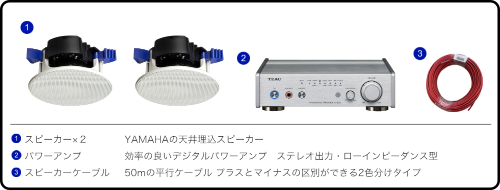 【セット内容】YAMAHA 開放型天井埋込スピーカー ×2/TEAC プリメインアンプ AI-303-S(リモコン付き)/10mスピーカーケーブル×2
