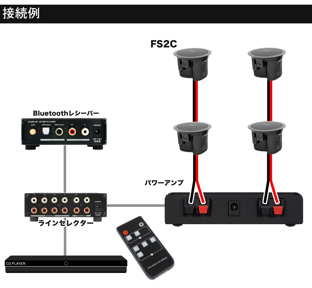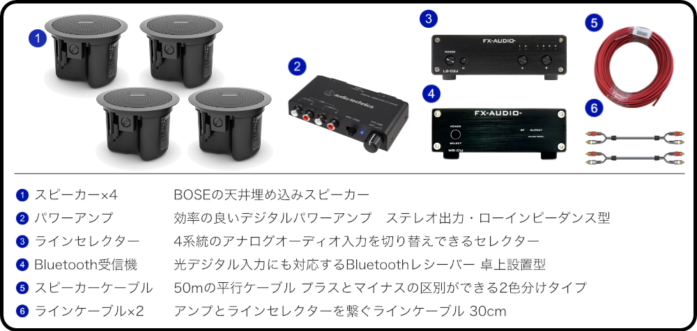 - 【セット内容】BOSE天井埋め込みスピーカー FS2CB(2本1組)×2(計4本)/audio-technica デジタルパワーアンプ/Bluetoothレシーバー/ラインセレクター/50cmRCAケーブル×2.スピーカーケーブル50m 店舗BGMやホームオーディオに最適な小型アンプと天井埋め込みスピーカーのセット スタッフのコメント: 【セットの特長】 自宅や店舗にお勧めのBluetooth受信機+ラインセレクターのセット。ラインセレクターを使用することで、最大4つの再生機器を繋ぎ、切り替えて使用することができます。例えば、BluetoothとCDプレイヤーを切り替えて使用する といった事が可能となります。ラインセレクターはリモコンにも対応しています。 【スピーカー本体の特長】 天井埋め込みスピーカーは、店内放送用に高域に特化したものと、音楽を流すためのフルレンジ型のものがあります。BOSEのFS2CWはフルレンジ型のスピーカーで、音楽再生にも人気のスピーカーとなっております。ホームオーディオ用にも多くお求め頂いている製品です。 【アンプについて】 店舗BGMやホームオーディオに最適なコンパクトなアンプ。当社店頭でも導入実績のある製品です。モノラルスイッチが付いており、ステレオ出力とモノラルサミング出力を選択可能。 こういった方にお勧め ・大音量は必要なく会話を妨げない程度の音量で音楽やテレビの音を流したい ・お手頃な店舗BGMシステムが欲しい ・リビングのテレビの音を少し離れたキッチンで聴きたい ・高度な機能は必要なく、コンパクトで手軽なシステムが欲しい ※こういった方はより高度なシステムがお勧め※ ・声の拡声で使いたい(マイクミキサーが必要) ・音楽を主体としたイベントやダンスレッスンで使いたい(音圧が必要) ・ボリュームコントローラーを壁埋め込みで実装したい(本製品は非対応) ・アンプからスピーカーまでの配線が30mを超える場合(ハイインピーダンス対応のアンプが必要) 当店では様々な天井埋め込みスピーカーセットをお取り扱い致しております。ご不明な点がございましたらお問合せ下さいませ。 【メーカーサイトより】 ボーズの定評ある天井埋め込み型/露出型スピーカーを刷新する 「FreeSpace FS」シリーズは、耐久性、デザイン、設置の簡易性を大 幅にアップグレード。シリーズ全体で驚くほど均一な音質を提供しま す。FreeSpace FSは、BGMとアナウンスの両方の用途で高品質のパフ ォーマンスを実現。あらゆる商業空間に最適です。本シリーズは、5つのモ デル展開で、いずれも70/100Vおよびローインピーダンス出力に対応 しています。また、新しい取り付けオプションに加え、統一された美しい外 観を備えています。パフォーマンスとコストを完璧なバランスで実現する FreeSpaceFSは、固定設備用に均一で高品質なサウンドをお求めの方に 最適です。 FS2Cは、1つのフルレンジ2.25インチトランスデューサーを搭載し、 83 Hzまでの低域再生と86 dB SPL/1W @ 1 mの感度を持つ天井埋め 込みモデルです。 ■システムの概要 推奨規模※ 店舗BGM(会話を妨げない程度)、ホームオーディオ 最大出力 10W/4Ω アンプ電源 DC15V、1.5A(付属のACアダプターを使用) スピーカー開口寸法 165mm ※規模につきましては会場の反響度合い、必要とする音量感によって異なりますので、参考程度になさって下さい。 ■取り扱いの簡単さ セットアップ難易度 ★★★☆☆ 解説 ・音響機器の設営自体は難しくありませんが、天井への穴開けや壁内配線の技術が必要となります。 凡例:★1つ…マイクを繋ぐだけで完了です。★5つ…音響機器に関する基礎的な知識が必要です。 ご確認ください。 ※仕様および外観は改善のため予告なく変更することがあります。 ※施工費は含まれておりません。ご自身で施工される際は、ご注文前にスピーカー取り付け箇所の強度・また取り付け用のネジが留められる下地があることをお確かめください。初期不良を含む製品の不具合またはその使用によって生じた直接、間接、及び精神的損害、逸失利益等の補償等につきましては、弊社は一切責任を負いかねます。 天井埋込みスピーカー セット一覧表 (別窓で表示)