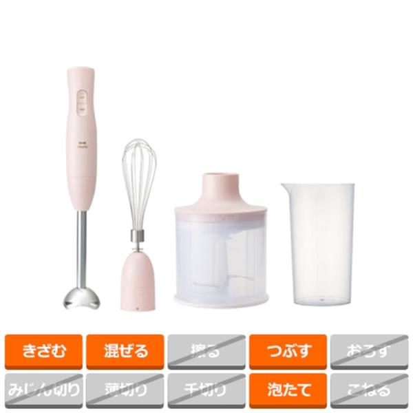 - つぶす・混ぜる・刻む・砕く・泡立てる、1台5役のハンドブレンダーがさらにつかいやすく!●付属の電子レンジ対応チョッパーボトルとブレンダーカップを使えば、下ごしらえからそのまま加熱調理までおまかせ。火を使わず、洗い物もぐっと減って調理がスムーズに進みます。●食洗機い対応で、後片付けやお手入れも簡単。スリム&コンパクトなデザインと豊富なアタッチメントで、毎日のお料理からスイーツ、離乳食まで幅広く対応。いつもの家事がもっと愉しく、ずっとラクになる頼もしいアイテムです。
