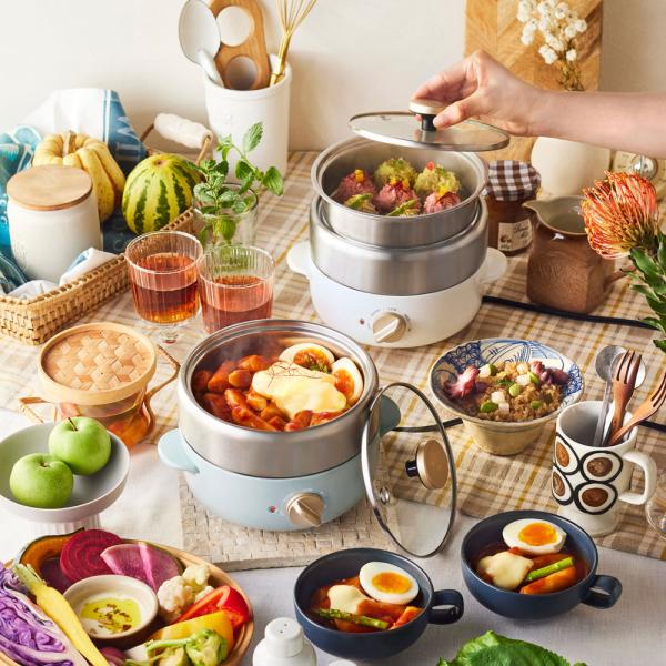煮る・焼く・蒸す・炊くが可能な1台4役が可能な「BRUNO(ブルーノ)」の電気鍋。1〜2人分の食卓にちょうどよいコンパクトサイズで、おかず・おつまみ・スイーツなど付属プレートを変えてメイン使いからサブ使いまで、マルチにお使いいただけます。