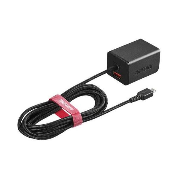 - バッファロー BSMPA2401BC2TBK 2.4A出力 AC-USB急速充電器 microUSB急速ケーブル一体型タイプ 1.8m ブラック発売日:2016年11月30日★長めで便利な1.8mのmicroUSBケーブル一体型。断線に強いファブリックケーブル&コネクターの付け根を保護するラバーブッシュ★充電方式の異なるiPhone、Androidを専用ICが自動で判別し、接続された機器に最適な充電(出力)を行うAUTO POWER SELECT機能付USBポートを搭載。★最大2.4Aの高出力でスマートフォン/タブレットを急速充電できる★スマートフォン/タブレットを急速充電できるUSB充電器。【仕様】対応機種・iPhone/iPadシリーズ ・USB充電に対応しているAndroidスマートフォン、タブレット ・PCのUSB充電に対応しているゲーム機・デジカメなどコネクタ形状USB Type-A(メス)×1、USB microB×1入力電圧AC100V-240V出力電圧DC5V出力電流最大2.4A(microB+Type-A 2出力合計)ケーブル長1.8m外形寸法(幅×高さ×奥行)33.4×47.3×32.5mm※ケーブル除く質量約87g動作環境温度5〜40℃、湿度10〜85%(結露なきこと)製品構成本体、取扱説明書、ケーブルバンド