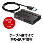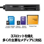 - 48メディア(変換アダプター使用で+6)に対応microSDやSDメモリーカード、コンパクトフラッシュ、メモリースティックなどスマホやデジカメの主要なメディアに対応。これ一台で様々なシーンでご利用いただけます。※一部アダプターが必要なものがあります。※メディアは一例になります。対応しないメディアもございます。コンパクトフラッシュのピン折れを防ぐ逆挿しを防止する出っ張りと、深く挿し込める設計で、コンパクトフラッシュのピンの折れを軽減します。メモが立つ、LEDが見やすい、使い方いろいろ便利なスリットカードリーダー上面にスリットを設け、LEDを眩しくせずに見やすい設計。また、スリットに名刺や写真、メディアなどのスタンドとして便利に使えます。ケーブル直付けで持ち運びに便利USBケーブルが本体直付けで、コンパクトに持ち運ぶことができます。また、USBケーブルを紛失してしまう心配がありません。ドライバーインストール不要ドライバーインストールが不要。USBポートに挿すだけですぐに使え、初めての方も安心してお使いいただけます。ACアダプター不要のバスパワーモデルパソコンのUSBポートから電源を供給するため、ACアダプター不要。デスク周りでもすっきりご利用いただけます。