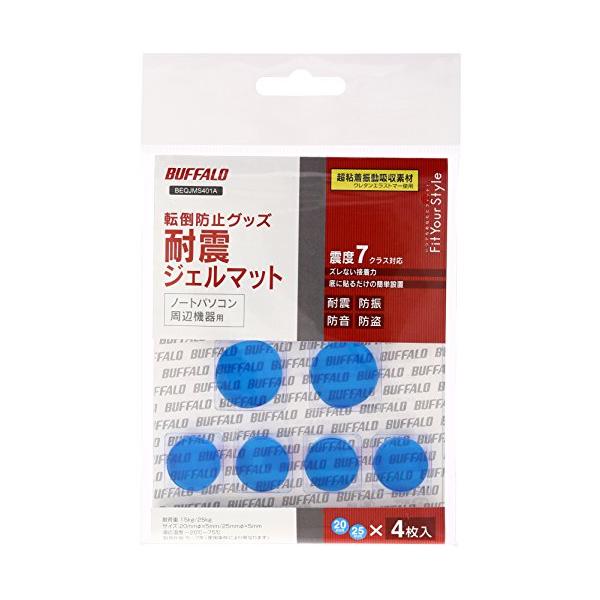 - コンピュータ機器、オフィス機器などの転倒を防止!大型キャビネット、金庫など地震の揺れからパソコンを守る!転倒を防止する粘着性耐震ジェルマット。(丸型・直径20mm/25mm・各4枚入り)■ ご家庭、オフィスのパソコン、周辺機器を震度7クラスの地震から守る!・低弾性と粘着性で、揺れに対して耐震性を発揮、1000ガル耐震試験をクリア・工事不要、マットだから敷くだけでOK・柔軟なので設置面に多少の凸凹があっても密着・水洗いで粘着力復活、繰り返し使用可能・急激に力がかかっても外れ難く、ゆっくり剥がすとキレイに元通り・-20℃〜75℃環境で使用可能・厚み5mm、スリムだからいろいろな機器にもフィット・機器類から発せられる振動・騒音の低減にも効果を発揮※本製品は事故や災害時に被害を受けないことを保証するものではありません。 バッファロー BEQ-JMS-401-A(耐震ジェルマット/丸型 直径20mm 4枚&25mm 4枚入り) [地震対策 耐震グッズ]