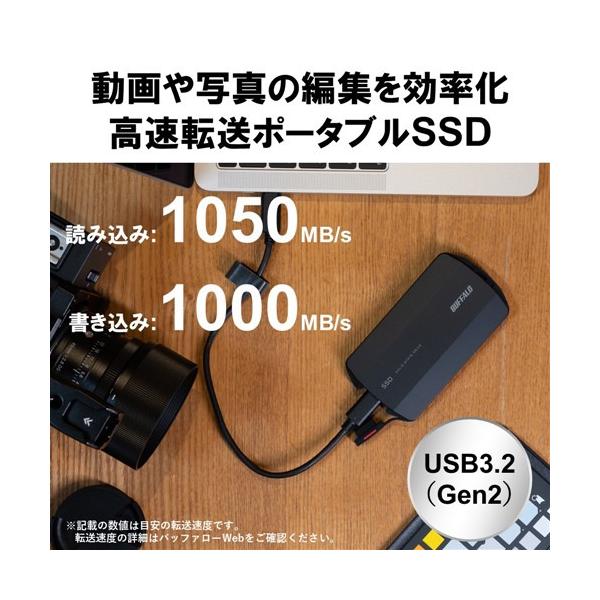- BUFFALO SSD-PHP500U3-BA 外付けSSD 500GB ブラック SSDPHP500U3BA発売日:2022年12月2日●大容量データを短時間でバックアップ アクセス方法を改善し、連続書き込み時の速度低下を抑制。CopyBooster使用でさらに高速に。●ファイルコピーを高速化 CopyBooster(コピーブースター) 本商品にて初搭載となるWindowsでのファイルコピーを高速化するアプリです。ユーザーは特別な操作を行うことなく、いつも通りエクスプローラーでデータコピーを行うことで高速化ができます。また、オリジナル機能として、コピー後に自動でUSBドライブを取り外す”USBドライブ取り外し予約機能”を搭載しています。*特許出願済み ●最大読み込み速度1、050MB/s、最大書き込み速度1、000MB/sの高速データ転送 最大読み込み速度1、050MB/s、最大書き込み速度1、000MB/sの高速データ転送を実現しました。動画の編集時の使用などにおすすめです。 ●屋外への持運びにも安心なIP55(防塵、防滴)機能搭載 大切なデータを守る耐衝撃・防塵・防滴仕様です。米国MIL規格「MIL-STD-810H 516.8 procedure IV」準拠※1。万が一の落下による衝撃から保存されたデータを守ります。また、当社が独自に行った2.1mからの落下試験にも合格※2。保存されたデータをしっかり守ります。※1. 試験サンプルを122cmの高さからすべての辺、面、角の合計26方向落下させます。試験サンプル5台以内で26方向落下すべてにおいて正常が確認できたら試験合格となります。※2. 2.1mの高さからSSDを床(インダストリアルカーペット)へ落下させます。落下させたSSDをPCに繋ぎファイルのリード/ライトを実施。これを10回繰り返して問題ないことを確認。本商品は、すべての状況・環境で、SSD/データ/外装ケースが破損しないことを保証するものではありません。また、動作中のSSDの破損を防ぐもので はありません。ドライブを故意に落下させたり、衝撃を加えないで下さい。●USB Type-AとUSB Type-Cケーブル付属USB Type-CケーブルでSurface GoやMac Bookに接続できる ●持ち運びに便利なストラップホールつきストラップが取り付けられるので持ち運びの際に便利です。また紛失防止策にもなるので安心です。 ※ストラップは付属しておりません●故障予測サービス「みまもり合図」に対応 パソコンに接続されている外付けSSDの自己診断機能「S.M.A.R.T.」情報をクラウドに蓄積し、お客様のSSDの健康状態を把握することで、SSDの状態判定をお知らせするサービスです。対応商品を接続しているパソコンにクライアントソフトウェア「みまもり合図」をインストールすることにより、本サービスが提供されます。 ●バッファロー正規データ復旧サービス対象商品障害レベルに応じた固定料金でデータの復旧が可能 【仕様】セキュリティー:SecureLock Mobile2(暗号化:AES 256bitソフトウェア方式)インターフェース:USB 3.2(Gen 2)/3.2(Gen 1)/3.1(Gen 2)/3.1(Gen 1)/3.0/2.0端子数:1端子形状:USB Type-C電源:USBバスパワー本体寸法(幅×高さ×奥行):57×12.2×106.5mm※突起物含まず本体質量:約79g動作保証環境:温度5〜35℃、湿度10〜85%保証期間:1年間主な付属品:USBケーブル(C to C、 30cm)、USB変換アダプター(C to A)、取扱説明書(保証書)※ユーティリティーはダウンロードにて配付。Windows:DiskFormatter2、SecureLock Mobile2、データ消去ユーティリティ、みまもり合図、CopyBooster、Mac:DiskFormatter for Mac、みまもり合図※保証書は取扱説明書に記載