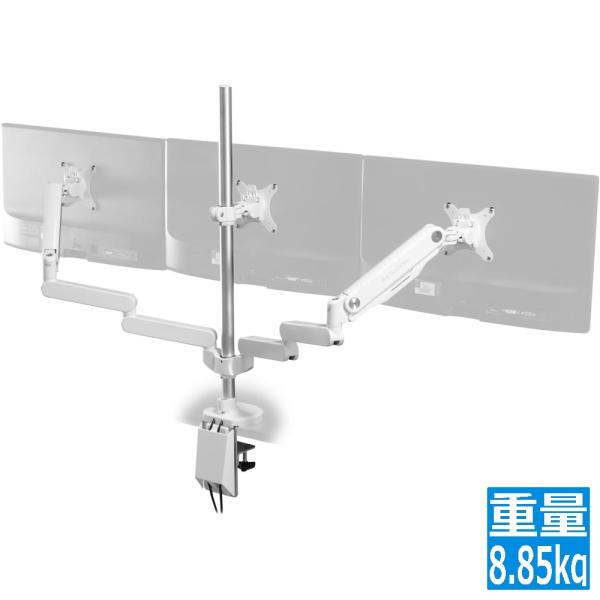 - ガス圧式のロングモニターアームガス圧式で軽い操作感のモニターアームです。全長約76cmのロングアームで、ディスプレイの配置も思い通り。機能まとめ・広い可動域のロングアームゲーミングデスクの可能性を広げる、最大約76cmのロングアーム。一般的なモニターアームより広い可動域で、『デスク横からディスプレイを伸ばす』『寝ながらゲームスタイルを構築する』など意外性のあるレイアウトが構築できます。・自由に動かせる作業内容やプレイスタイルに合わせて、自由にディスプレイを配置できるモニターアーム。前後の伸展はもちろん、ガス圧式で上下の微調整もらくらく。・大型モニターにも対応ロングアームで大型サイズのモニターにも無理なく対応。※事前にディスプレイのサイズ・重量をご確認ください。・デスクの上がすっきり片付くモニターアームを導入すれば、デスクの上もすっきり広々。場所をとるスタンドを排除して、余裕のある作業スペースを確保できます。・長時間のゲームプレイにゲーマーの多くが悩む、首・肩のこりや目の痛み。ディスプレイが適切な位置にないことが原因かもしれません。モニターアームを活用して、長時間のゲームプレイも快適な環境を構築しましょう。・ロングポールディスプレイをあらゆる高さに設定できる、ロングボールを採用。トリプルタイプは、縦積みレイアウト※にも無理なく対応します。※横向き2列・アーム位置の調整お好みの高さでリングを固定してから、アームを取り付けます。重たいアームを支えながらネジ締めする必要なく、一人でも簡単に取り付け位置を調整できます。・7軸可動一般的なモニターアーム(2〜4軸)よりも関節数が多い、7軸設計。細かく動かせるので、ディスプレイ配置も思うがまま。・ガス圧式で軽い操作感先端のアームは、内部にガスシリンダーを搭載。力をかけずに上げ下げすることが可能です。・デュアル(2画面)タイプマルチタスクなゲーマーに。1画面でゲームをしながら、もう片方で攻略サイトや動画を表示する、チャットソフトを使うなど、使い方無限大。・トリプル(3画面)タイプ横に広い視野を必要とする、FPS・RCGゲーマーに。左右いずれかを縦向きに設置すれば、長いテキストの編集時やSNS閲覧にも便利。・VESA規格対応付属のVESAプレートは、75mmまたは100mmピッチの2種に対応。※取り付けるディスプレイのVESA規格と一致するかどうか、事前にご確認ください。・クイックリリース式で簡単取り付けVESAプレートをディスプレイの背面に固定したら、モニターホルダーにカチッと音がなるまではめ込むだけ。一人でも簡単かつ安全に取り付けられます。・クランプ式/グロメット式固定デスクへの固定方法を以下のいずれかから選択できます。クランプ式:デスクに傷をつけずに固定できるグロメット式:デスクにスクリューを通してがっちり固定※取り付けるデスクの耐荷重や強度に問題がないことを事前にご確認ください。・モニターホルダーの固さ調節モニターホルダーの関節が固くて動かない、ゆるくてすぐに傾いてしまう、などディスプレイの角度調整に問題がある場合は、ボルトを締める(緩める)ことで調節できます。※モニターホルダーのネジは到着時点で緩んでいる場合がございます。モニター取り付け前に各ネジを増し締めし、しっかりと固定されていることを確認してからモニターを取り付けてください。・USBポート離れた場所にあるPCやコンセントから電源を引いてきて、短いケーブルのデバイスも卓上でスマートに管理可能です。・ケーブルホルダー&クリップアームの底面には、ケーブル収納スペースを設けています。支柱に取り付けられるクリップも付属し、ディスプレイまわりの配線を隠してスッキリまとめられます。・スタンディングデスクに最適スタンディングデスクを昇降して使用する場合、都度ディスプレイも高さの微調整を行う必要があります。上げ下げらくらくなガス圧式モニターアームがおすすめです。SPECカラーホワイト寸法寸法図参照重量8.85kg構造部材アルミニウム、プラスチック、スチール表面加工粉体塗装対応デスク天板厚クランプ式:20~120mmグロメット式:20~100mm取付可能モニター重量2kg 以上、9kg 以下※1アームあたり■ ご注意 ■・ ご注文のタイミングにより、納期がかかる、又は完売などの場合もございます。・ こちらの商品は配送日時指定が出来ない商品となります。・ 商品の情報/詳細、画像について保証は致しかねます。・ 画像はイメージです。商品以外が含まれる、又は商品と異なる場合があります。・ 必ずメーカーホームページなど合わせてご確認ください。・ ご注文確定後のキャンセル・返品・交換は出来かねます。・ 代引きは対応できないため、キャンセルとなります。・ 北海道、沖縄、その他離島は配送致しかねます。・ 配送センターより直送のため、他商品と同梱はできません。あらかじめご了承ください。※ メーカー在庫状況は毎週更新して