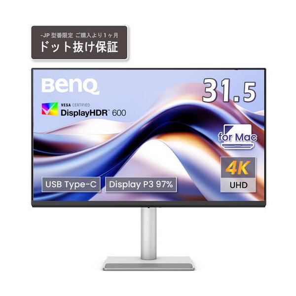 - BenQ ベンキュー 31.5インチ MacBook向け4K HDRモニター31.5インチ MacBook向け4K HDRモニター■ 駆動方式:IPS 型■ 液晶パネルサイズ:31.5型■ 最大解像度:3840×2160■ 最大リフレッシュレート:60Hz■ コントラスト比:1300対1■ バックライト光源:LED■ HDMI端子:2■ 内蔵スピーカー:3W×2■ VESAマウント対応:100mm ×100mm■ ピボット対応:○■ 重量:9.1kg★ USB -C ケーブル1本でMac画面を拡張★ MacBookからMac画面とモニターの輝度や音量を調整★ 90Wと15W給電のUSB-Cポートを搭載■ HDR:HDR10, VESA DisplayHDR 600■ 色域:sRGB 99% , P3 96%■ カラーモード:Display P3, sRGB, HDR, M-Book, ユーザー, ゲーム, ePaper, コーディング, Cinema■ チルト:-5° - 20°■ スウィーベル:15°/ 15°■ ピボット:90°■ 高さ調整:115 mm■ 自動ピボット:○■ 付属品:電源ケーブル、HDMI 2.0(各約1.8m)、USB 3.2 Gen1 Type-C、クイックスタートガイド, 保証書, Safety Instruction※ 製品及び付属品のデザイン・色・仕様等は予告なく変更される場合があります ※ドット抜け、色むらについて 液晶パネルには、ドット抜け、常時点灯、及び色むらが存在する場合がございますが これらは液晶パネルの構造によるものであり、初期不良や故障にはあたりません。 これによる返品・交換には対応できませんので予めご了承ください。 ただし当商品に関してはご購入より1か月の無輝点(ドット抜け)保証が付随しており、"メーカーにて"保証を受ける事が可能です。