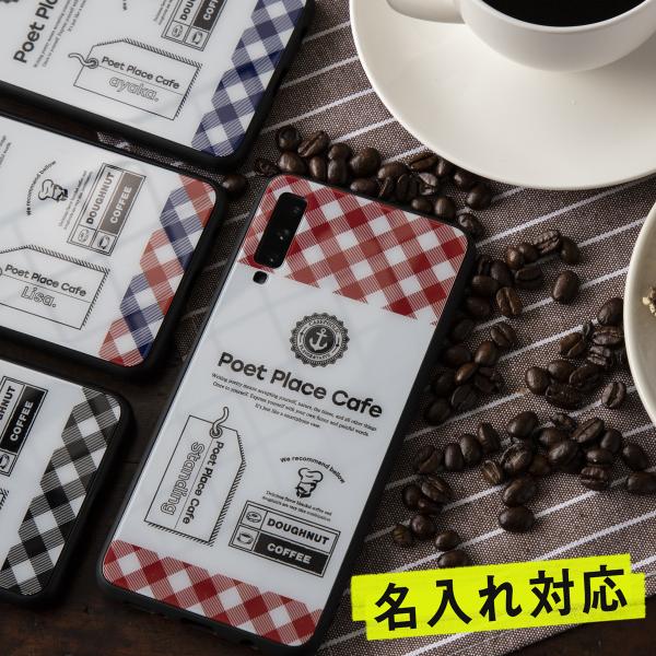 Galaxy A7 ケース カバー スマホケース ガラス かわいい おしゃれ カフェ チェック柄 チェック cafe 名入れ チェックラベル ガラスケース 40代 50代