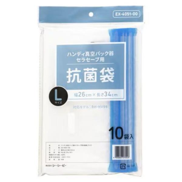 - お店TOP>ホーム&キッチン>保存容器・ストッカー>保存容器>真空パック・脱気密封器>CCP ハンディ真空パック器 セラセーブ用抗菌袋 Lサイズ EX-4051-00 (10枚入り)【CCP ハンディ真空パック器 セラセーブ用抗菌袋 Lサイズ EX-4051-00の商品詳細】●コンパクト設計:直径 約40mm×長さ170mmの筒状デザイン●簡単操作:ワンプッシュで真空パック完成●USB Type-C充電式:約80分の連続使用が可能●抗菌加工袋:安心・安全な食材保存●繰り返し使用可能:専用袋は洗って再利用可能(※一部除く)【規格概要】サイズ:幅260x長さ340mm【発売元、製造元、輸入元又は販売元】CCP(シー・シー・ピー)リニューアルに伴い、パッケージ・内容等予告なく変更する場合がございます。予めご了承ください。CCP(シー・シー・ピー)東京都台東区寿3-14-11蔵前チヨダビル3F075-692-1001広告文責:楽天グループ株式会社電話:050-5577-5043[食器・カトラリー]