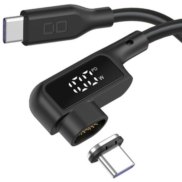 - リアルタイムで電力が見える!心くすぐる出力表示ディスプレイ!カチッとくっつくデータ転送対応マグネット充電ケーブル「マグネットシリコンケーブル 100W対応 ディスプレイ付き L字タイプ CtoC 2m」■ゲームや動画視聴、PCの充電等に場所を取らないL字型プラグ■カチッとくっつくデータ転送対応マグネット充電ケーブルiPhone 15 など、スマートフォン や USB type-C ポート搭載機器に ケーブル を近づければ磁石でカチッと吸着して充電。そんな圧倒的な手軽さと利便性を持った充電ケーブルです。データ転送速度は最大480Mbpsを実現し、写真や動画・音声等のデータを素早く転送することが可能です。■PD 急速充電 100W 対応で様々な機器を安定して充電100Wの大出力やUSB-PDにも対応するケーブルを採用しているので、スマホだけではなく、ノートPC (MacBook Pro / Surface / Lenovo など)もらくらく充電可能。※100W急速充電には100W出力以上に対応したACアダプタが必要となります。お持ちでない方はCIOが販売する充電器がおすすめです。■徹底的にこだわったCIOならではの安全性端子とコネクタが分離しているために発生しやすい通電トラブルに対応するため、マグネットケーブルにポゴピンを実装しています。1つ1つのピンが各種通電機能を端子とコネクタ間で確認し合い、問題無ければ通電する仕様です。さらに万が一の過充電や異常な発熱などから大切なデバイスを守るため、充電保護システムe-Marker(イーマーカー)チップを搭載しました。目先の便利さだけではなく、より安心して長くご使用いただきたい。そんな想いを体現しました。■しなやか過ぎて絡まない、折り曲げテスト30000回クリアのシリコンケーブル外装にシリコン素材を使用したことで、従来のケーブルにはない柔らかい質感を実現しました。優しい使い心地をご体感ください。カバンやポケットに入れても絡みにくく、出し入れもスムーズに行えます。折り癖や巻き癖が付きにくいため、いつでもストレスフリーにご使用いただけます。30000回の折り曲げテストを実施し、断線しにくい優れた耐久性を実現。ケーブル内部のワイヤーを断線から保護し、安心して急速/高速充電することが出来ます。■長さ選べる0.5m/1m/2m用途に応じ長さの選択が可能。日本ブランドだからこそ、0.5m/1m/2mと日本基準の長さをご用意。デスク周りやバッテリーと合わせて所持するには0.5〜1m、ベッド周りやソファ周りは2mなど、用途に応じて選択いただけます。
