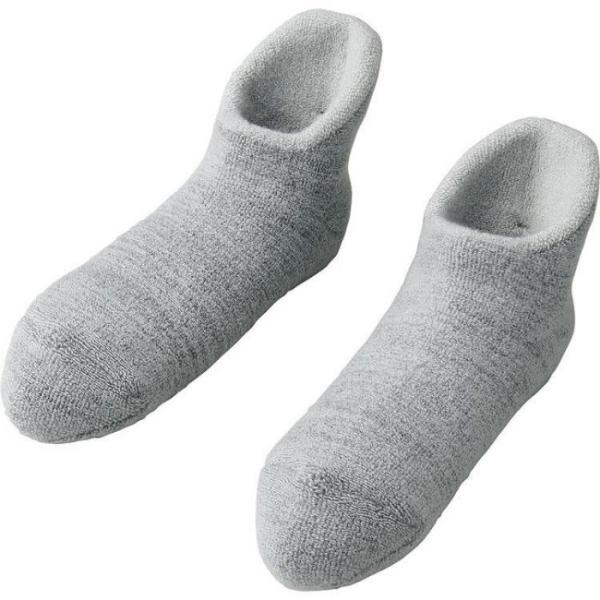 - あたたかさケタ違い! 極厚タイプで規格外のあたたかさ! 二重編み構造で魔法びんのようにあたたかさをキープ。 内側のつま先とかかと、足首部分に繊維自身が吸湿発熱する保温素材の東洋紡のエクス糸を使用しています。 湿気を吸って繊維自身が熱を発生させ、放置してムレ感やベタつき感のないサラッとした心地よさを維持します。 外側は備長炭素材で全体を包み込むのでまるで魔法瓶のように暖かさをキープします。 つまみやすい形状なので、手がふさがっている時も片手でラクラク着脱できます。 一般的な靴下と比較すると厚みがかなりあるので、クッション性が抜群でスリッパがいりません。 締め付けないパイル編みなので、暖かさがあるのにサラッとした履き心地です。 つま先裏にすべり止めがついているので階段やフローリングでも滑りにくく安心です。 【サイズ】 W107×D57×H230mm 内容量:2枚組 重量:135g 【素材・原材料名・成分】 表側:アクリル、綿、ナイロン、レーヨン、その他 裏側:アクリル、ナイロン、毛、合成繊維(エクス(R))、その他 【原産国】 日本 【注意事項】 お肌の弱い方、アレルギー体質の方はご使用にならないでください。 血行障害、糖尿病の方、足裏に傷、湿疹、はれもの、ケガなどがある方は、医師にご相談の上ご使用ください。 使用中、使用後に赤み、はれ、かゆみなどの異常があらわれた場合は直ちにご使用をお止めください。 長時間使用する際やきつく感じる場合は、適度に着脱を繰り返してください。 使用時に走ったり、飛び上がったりしないでください。転倒の恐れがある場所では、ご使用にならないでください。 着用の際は爪やアクセサリー、鋭利なものなどでひっかけないようご注意ください。 素材の性質上、摩擦により毛玉が生じる場合があります。その際は無理に引っ張らずにハサミなどで取り除いてください。 色の出方は商品によって異なります。 水や汗などにより湿った状態で強く擦ったり放置すると、他のものや衣服に色移りする恐れがあります。濡れたまま放置せず、万一色移りした場合は早めに洗濯してください。また、他のものと一緒に洗ったり、つけ置き洗いはお避けください。 この商品は洗濯により収縮する恐れがありますので形を整え陰干ししてください。 洗濯機の手洗いモードでは洗えません。 本来の用途以外には使用しないでください。 火気厳禁。 使用感には個人差があります。