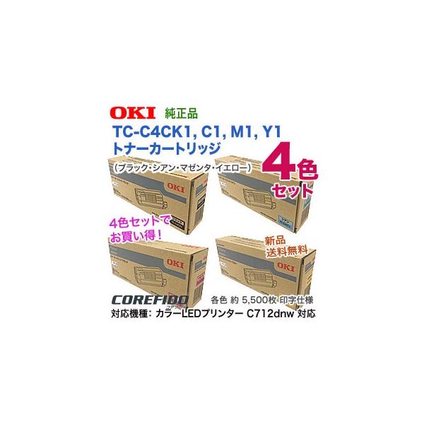 【4色セット】 OKIデータ TC-C4CK1, C1, M1, Y1 (ブラック・シアン・マゼンタ・イエロー) トナーカートリッジ 純正品 新品 (カラーLEDプリンタ C712dnw)