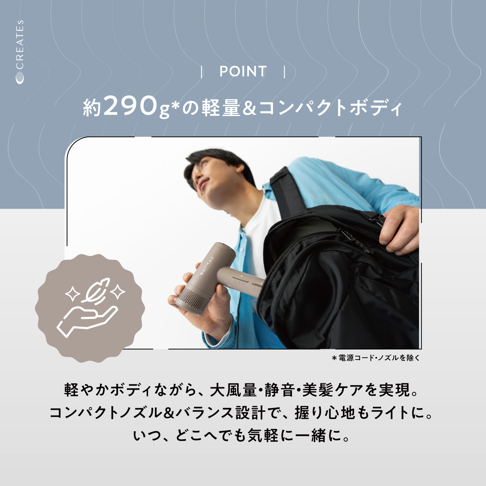 - ヘアケアを軽やかに持ち歩けるドライヤー、ノマドラ コンパクト 軽量 静音 パワフル
