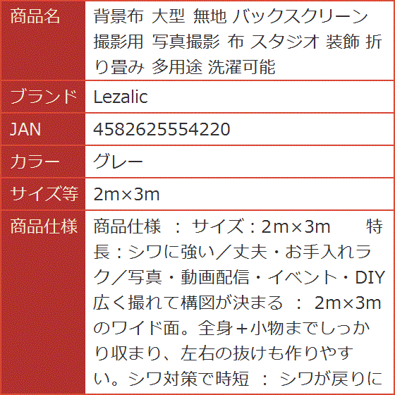 - バリエーションコード : 2buv3lo0wf商品コード2buv3klgon商品名背景布 大型 無地 バックスクリーン 撮影用 写真撮影 布 スタジオ 装飾 折り畳み 多用途 洗濯可能ブランドLezalicカラーグレーサイズ等2mx3m商品仕様 : サイズ:2mx3m 特長:シワに強い/丈夫・お手入れラク/写真・動画配信・イベント・DIY広く撮れて構図が決まる : 2mx3mのワイド面。全身+小物までしっかり収まり、左右の抜けも作りやすい。シワ対策で時短 : シワが戻りにくい素材。軽く伸ばすだけで整い、急な撮影やライブ配信でも即セット。タフに長く使える : 摩耗に強く形崩れしにくいから、スタジオ常設や毎日の物撮りでも安心。ご注意 : *製造ロットにより、同じカラーでも色味に若干の差が出る場合がございます。また、お使いのモニター環境により実際の色と見え方が異なることがございますので、あらかじめご了承ください。*本商品は一枚布仕様で、ポールを通す穴などの加工はございません。※ 他ネットショップでも併売しているため、ご注文後に在庫切れとなる場合があります。予めご了承ください。※ 品薄または希少等の理由により、参考価格よりも高い価格で販売されている場合があります。ご注文の際には必ず販売価格をご確認ください。※ 沖縄県、離島または一部地域の場合、別途送料の負担をお願いする場合があります。予めご了承ください。※ お使いのモニタにより写真の色が実際の商品の色と異なる場合や、イメージに差異が生じることがあります。予めご了承ください。※ 商品の詳細(カラー・数量・サイズ 等)については、ページ内の商品説明をご確認のうえ、ご注文ください。※ モバイル版・スマホ版ページでは、お使いの端末によっては一部の情報が表示されないことがあります。すべての記載情報をご確認するには、PC版ページをご覧ください。