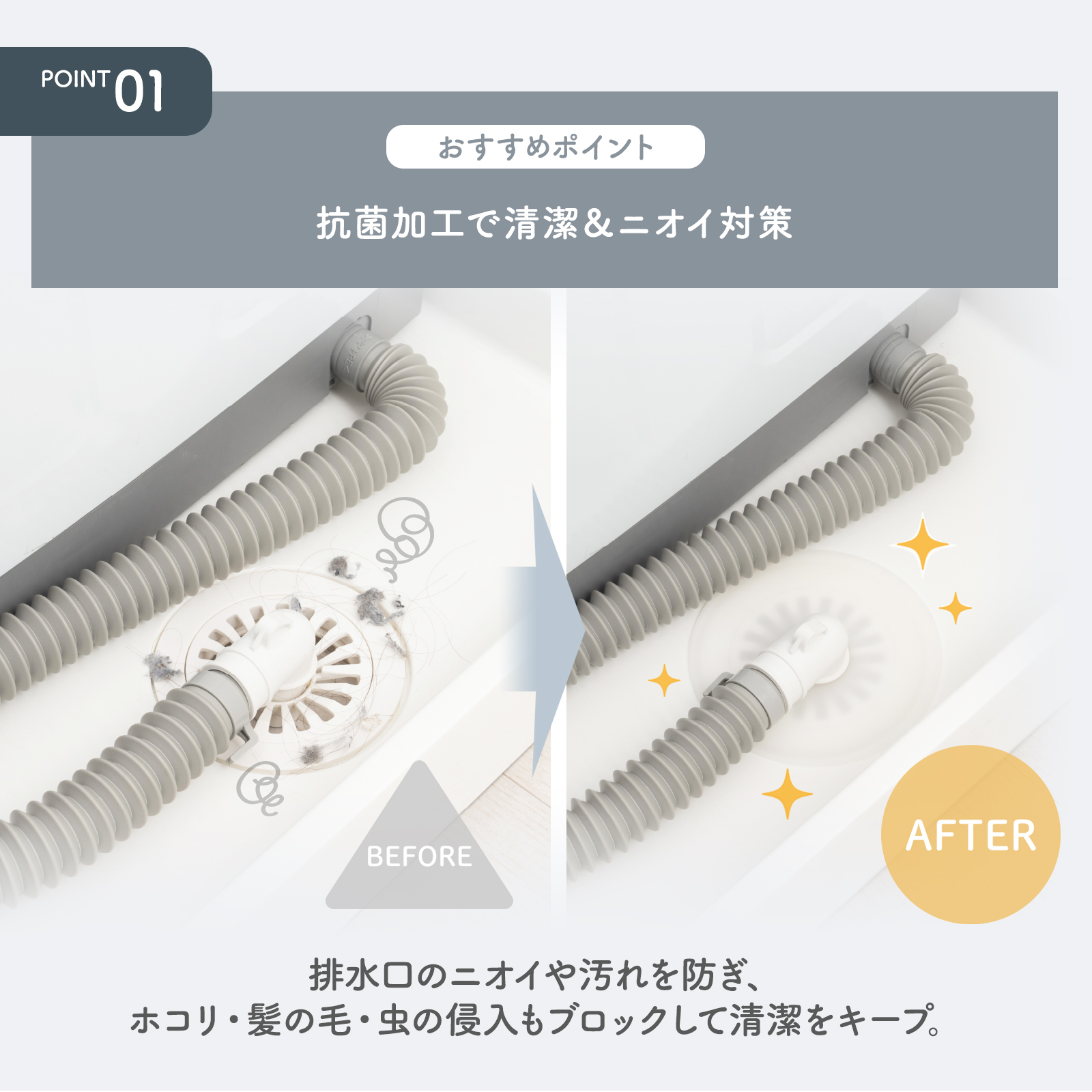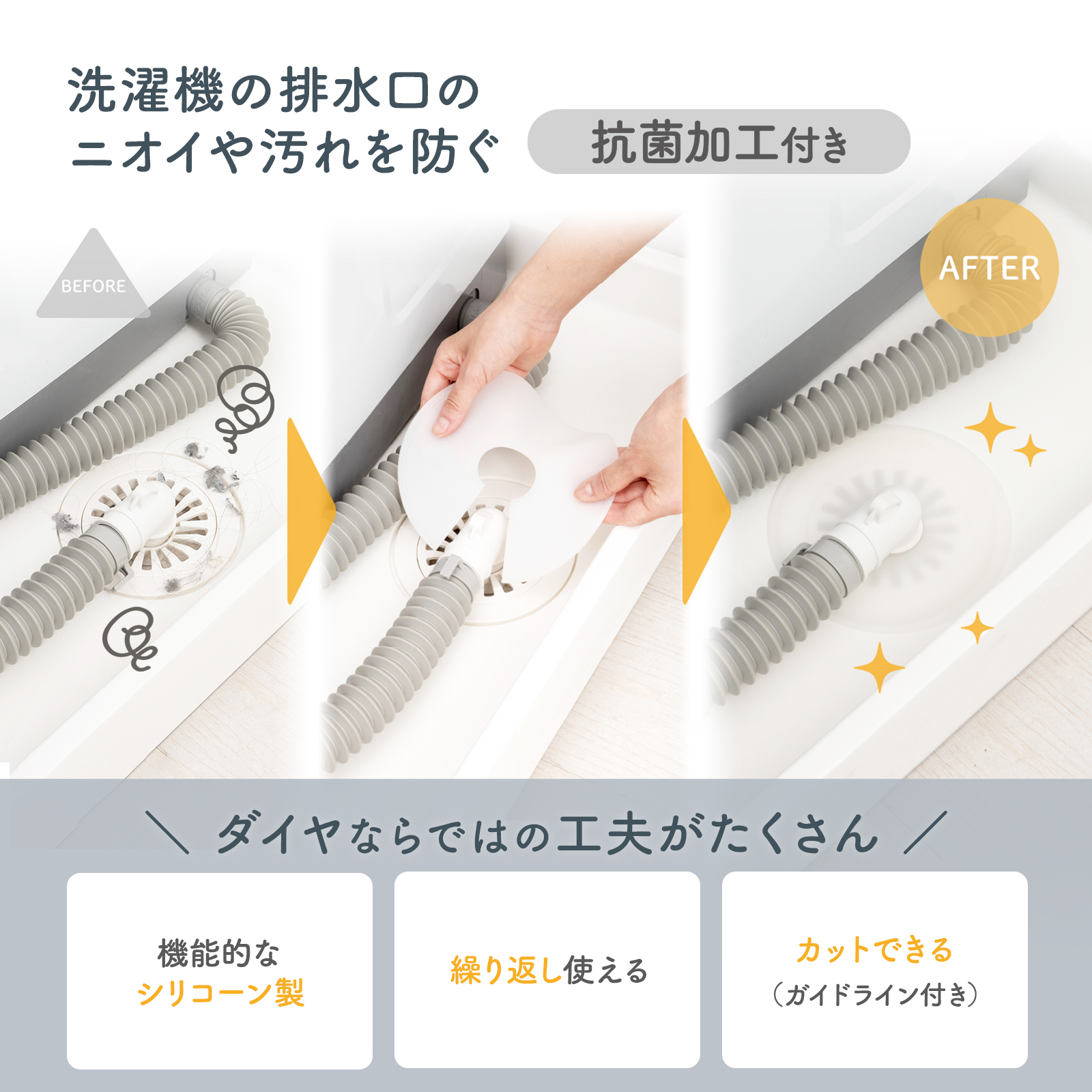 洗濯機の排水口のニオイや汚れを防ぐ抗菌加工付き排水口カバーです。キッチンや洗面台の排水管のスキマにもお使いいただけます。埃や髪の毛、排水口からの虫の侵入を防ぎ、排水口を清潔に保つことができます。