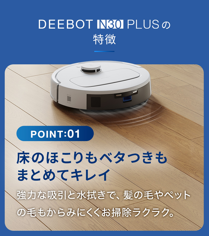 - ECOVACS (エコバックス) DEEBOT N30 PLUS 吸引力10,000Pa ロボット掃除機 水拭き両用 自動ゴミ収集 大容量バッテリー PureCyclone バッグレス設計 ZeroTangle 2.0搭載 マッピング ゼロタングル 強力吸引 アプリ操作 落下防止システム Alexa対応 清掃予約 お掃除ロボット ブラック 【ZeroTangle 2.0ブラシ搭載】 – 独自の3層V字構造により、髪の毛やペットの毛が絡まずスムーズに吸引。45°のV字ブラシで毛を持ち上げ、スパイラルブラシで中央に集め、さらにコームで自動的にほぐす仕組みで、掃除のたびに絡まりを気にせず常に快適。長い毛や大量の毛でも、清掃性能を落とさずに徹底的に取り除ける設計。 【PureCyclone自動ゴミ収集ステーション】 – メインサイクロン+14個の小型サイクロンによる二重分離で空気と粉塵を95%以上効率的に分離。さらに4段階フィルターで微細なホコリもキャッチ。吸引力が長期間持続し、ニオイや目詰まりを徹底防止。従来モデルより環境性能が向上し、清潔で持続的な清掃環境を実現。 【バッグレス設計で経済的かつエコフレンドリー】 – 消耗品であるダストバッグを一切必要とせず、ワンプッシュで簡単にゴミを捨てられる仕組み。最大45日間分のゴミを収納できる大容量コンテナで、手間もコストも削減。ランニングコストがかからず、環境にも財布にも優しい次世代設計で、よりスマートな生活をサポート。 【TrueMappingテクノロジーで家中を正確にマッピング】 – 高精度センサーとアルゴリズムで素早く間取りを認識し、最適な清掃ルートを自動計画。20mmの段差を難なく乗り越え、ラグや敷居もスムーズに走行。家全体を効率的にカバーし、無駄のない徹底的な清掃を実現。広い家や複雑な間取りでも安心して任せられる設計。 【強力性能と便利なアプリ操作】 – 10000Paの強力吸引とモップ機能を1台で実現。専用アプリから清掃モード切替やスケジュール設定が可能で、Apple Watchやスマホウィジェットにも対応。5200mAhの大容量バッテリー搭載で長時間の運転ができ、複数フロアのマップ管理やスポット清掃、ゾーン指定清掃まで自在にコントロール可能。
