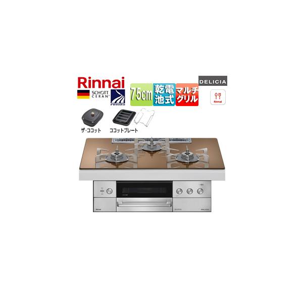 - RHS72W39M12RCSTW リンナイ 【SALE】ビルトインガスコンロ デリシア[75cm][乾電池][シンプル][ガラストップ:スパークリングカッパー][ごとく:ステンレス][ザ・ココット付属][ココットプレート(ワイド)付属]▲